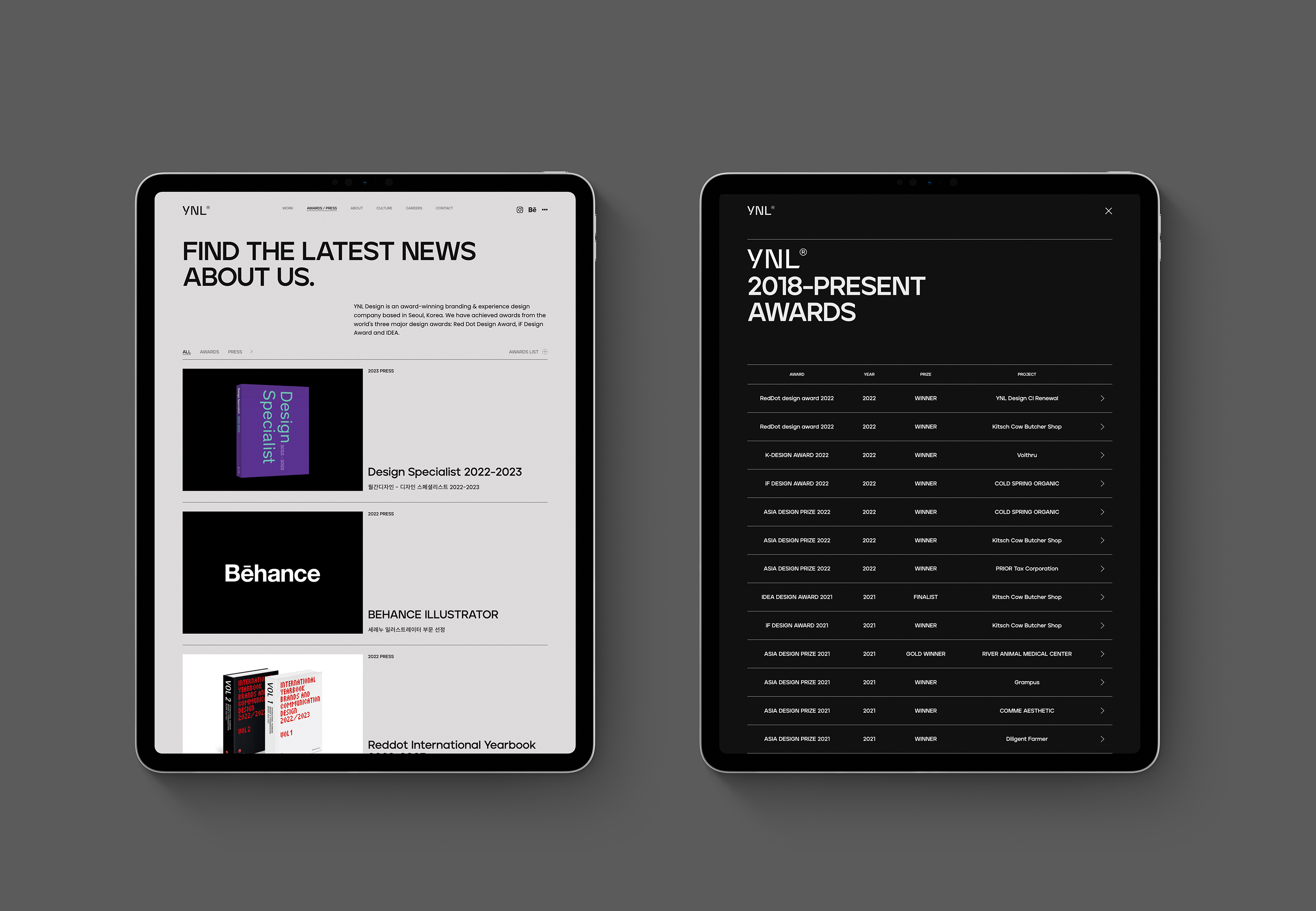 YNL Design의 ‘YNL Design Website Renewal (YNL Design 웹사이트 리뉴얼)’ Brand Identity 프로젝트가 독일 ‘reddot design award 2023 (2023 레드닷 디자인 어워드)’ Brand & Communication 부문에서 본상 (WINNER, 위너)을 수상하였습니다.