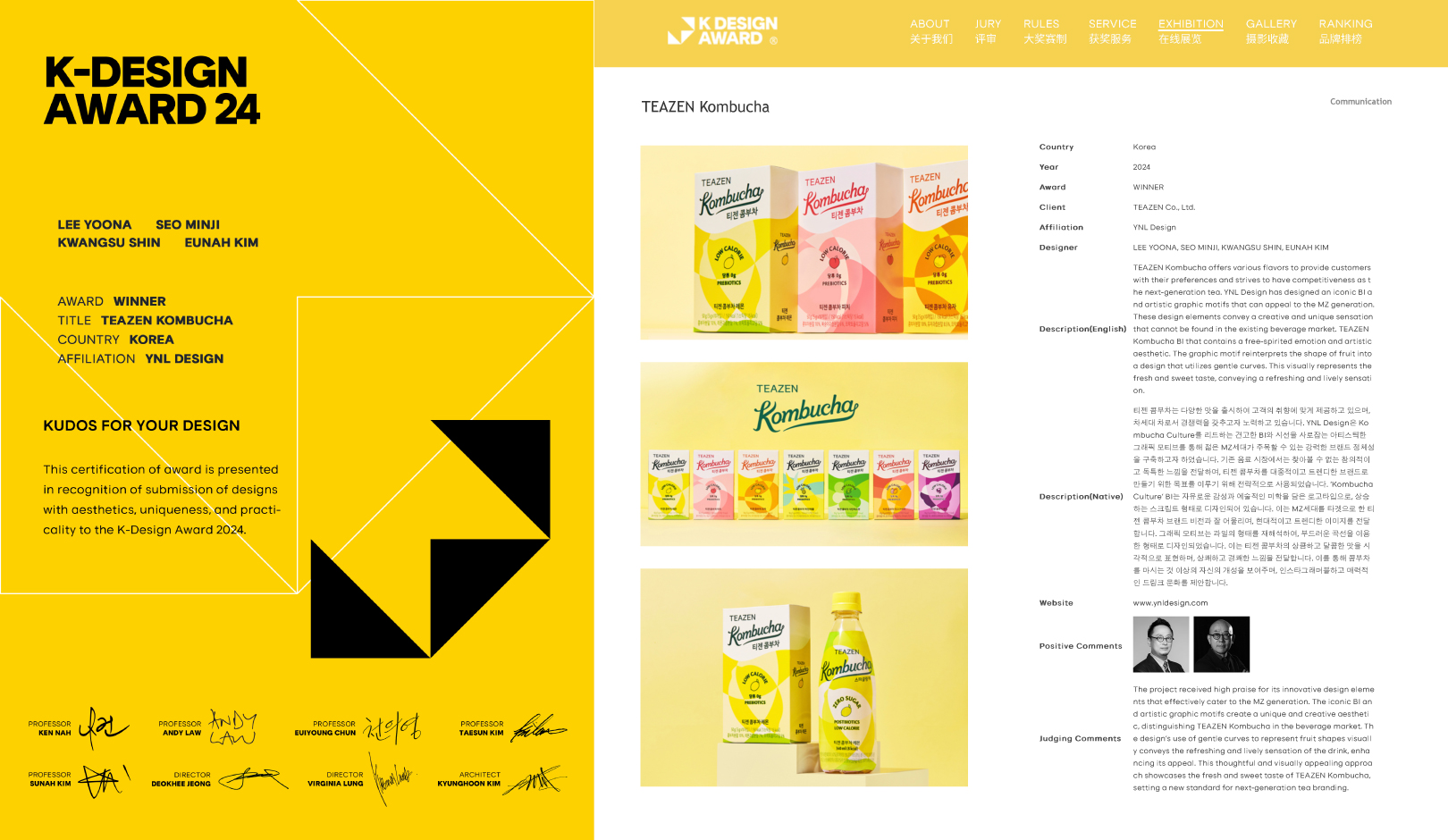 그중 YNL Design은 ‘K-DESIGN AWARD 2024 (K-디자인 어워드 2024)’에서 WINNER (TEAZEN Kombucha - 티젠 콤부차)를 수상하게 되는 영광을 얻었습니다.