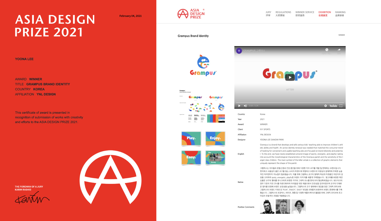 그중 YNL Design은 ‘ASIA DESIGN PRIZE 2021 (2021 아시아 디자인 어워드)’에서 총 GOLD WINNER 1개 작 (RIVER ANIMAL MEDICAL CENTER - 리버동물의료센터), WINNER 3개 작 (Grampus - 그램퍼스, COMME AESTHETIC - 꼼에스테틱, Diligent Farmer - 부지런한 농부)으로 총 4관왕을 수상하게 되는 영광을 얻었습니다.