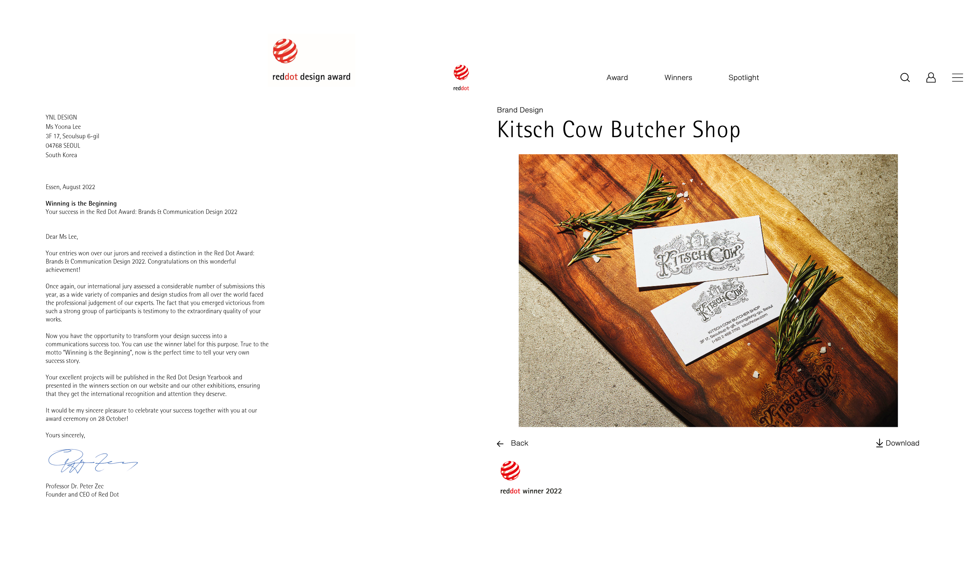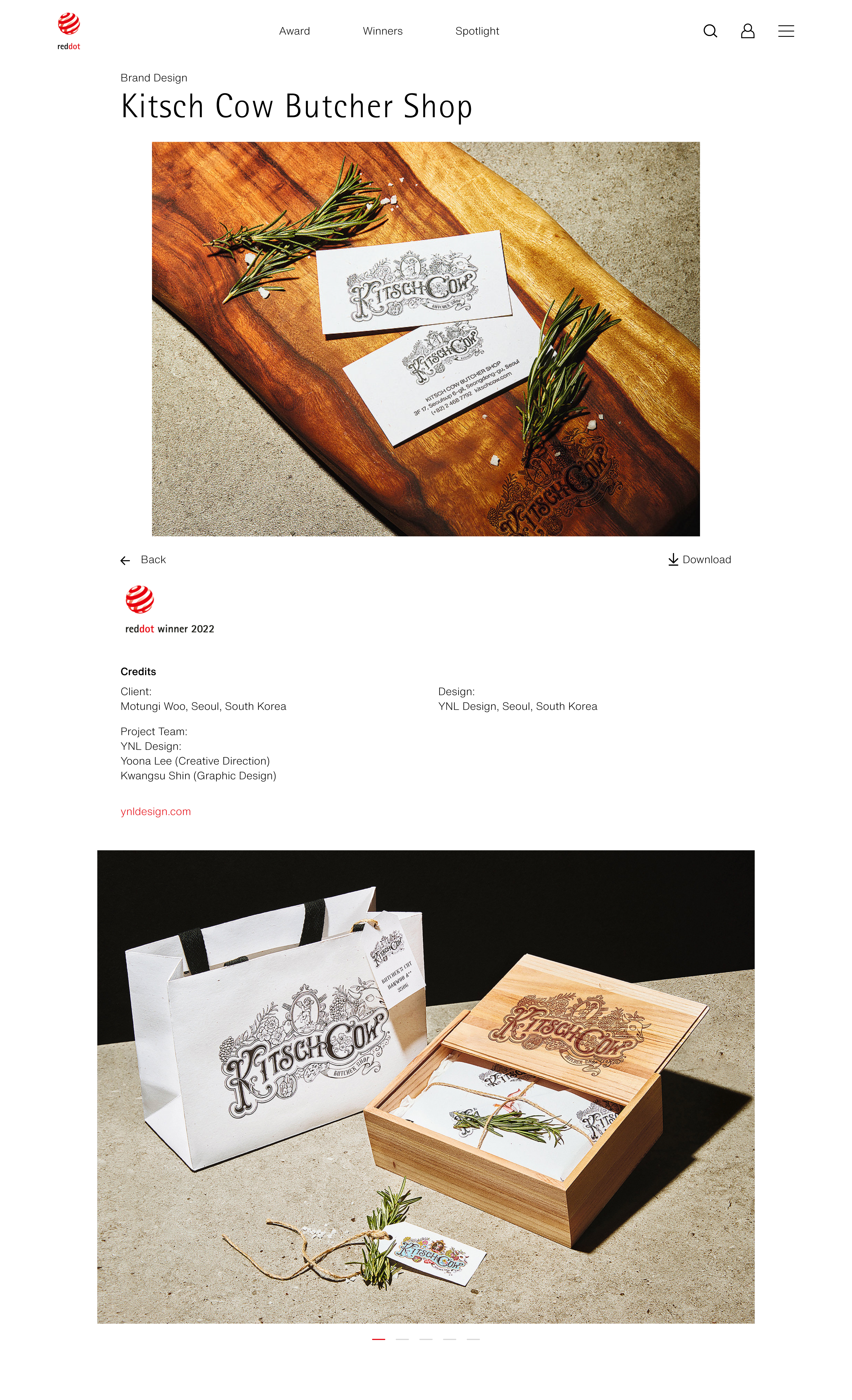 YNL Design의 ‘Kitsch Cow Butcher Shop (키츠카우 부처 샵)’ Brand Identity 프로젝트가 독일 ‘reddot design award 2022 (2022 레드닷 디자인 어워드)’ Brand & Communication 부문에서 본상 (WINNER, 위너)을 수상하였습니다.