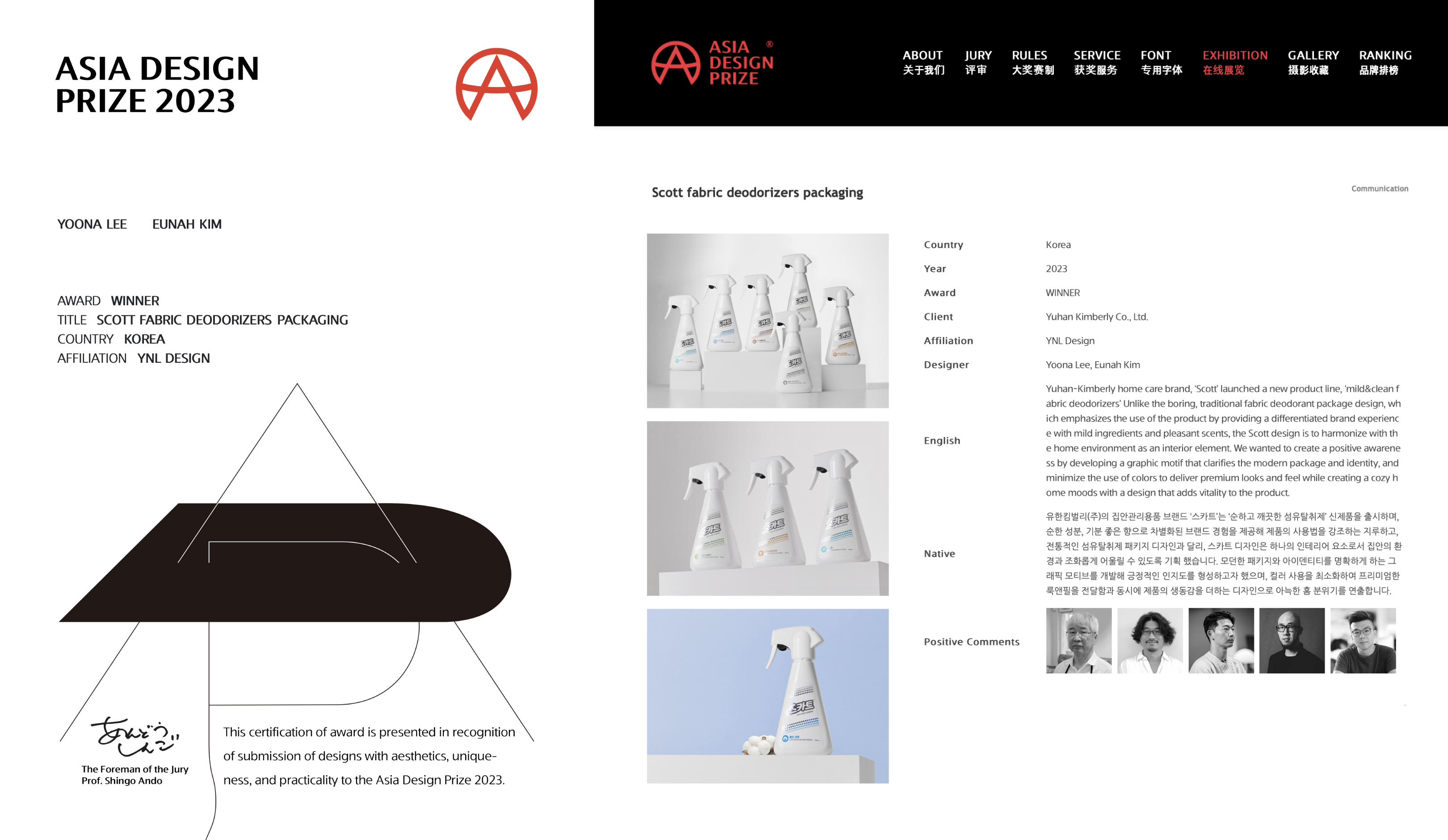 그중 YNL Design은 ‘ASIA DESIGN PRIZE 2023 (2023 아시아 디자인 어워드)’에서 총 WINNER 3개 작 (YNL Design CI Renewal – 와이앤엘 디자인 리뉴얼, Khasto – 카스토, Scott – 유한킴벌리 스카트)으로 총 3관왕을 수상하게 되는 영광을 얻었습니다.
