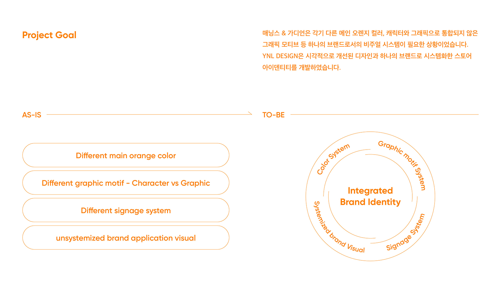 Mannings & Guardian은 건강한 신체와 마인드가 진정한 아름다움이라 여깁니다. 내면의 건강과 외면의 뷰티를 모두 케어하여 더 나은 삶을 약속하는 브랜드입니다. YNL Design은 내면과 외면의 아름다움을 동시에 나타내는 ‘Beauty Flow’를 컨셉으로 건강한 내면의 아름다움이 외면의 아름다움으로 흐른다는 브랜드의 핵심 가치를 표현했습니다. 면과 선이 어우러지는 둥근 커브 형태로 건강과 뷰티를 동시에 관리할 수 있는 Mannings & Guardian의 헬씨 뷰티를 그래픽 모티브로 시각화했습니다. 브랜드 메인 컬러 오렌지와 서브 컬러인 옐로우가 보이는 면은 이너뷰티와 고객이 만나 고객들에게 생기는 새로운 경험과 만족을 의미합니다. 또한, 기존 소비자의 눈에 띄지 않던 매장의 디파트먼트에 키 컬러를 부여하고 일관된 그래픽 모티브를 적용함으로써 카테고리별 네비게이션을 구축했습니다. 새로 업데이트된 매장 가이드인 토네이도 2.0+를 도입하면서 소비자가 매장에서 네이게이션 할 수 있도록 하는 디자인 전략이 필요했고 각 디파트먼트 사이니지와 카테고리에 체계화된 디자인 시스템을 부여했습니다.