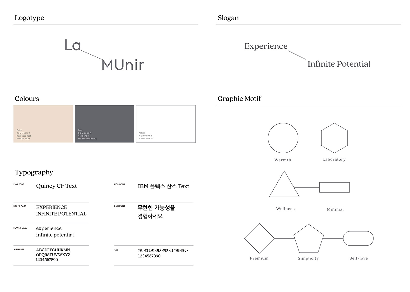 우리는 라뮤니르의 로고, 색상, 타이포그래피, 그래픽 모티프, 가이드 라인 및 패키징을 포함한 전체적인 브랜딩을 개발했습니다. 클리닉 느낌을 지향하는 브랜드의 가치에 따라 화학식에서 영감을 받아 예상치 못한 대문자 U를 사용한 로고에 'La'와 'MUnir' 단어를 연결하는 최소한의 선으로 로고 타입을 개발하였습니다. 또한 고객의 무한한 잠재력 향상을 고려하여 'Experience Infinite Potential'(무한한 가능성을 라뮤니르와 함께 경험하세요)이라는 브랜드 슬로건을 개발했습니다. 그래픽 모티프는 미니멀한 방식으로 형성된 독특하게 연결된 화학 구조입니다. 각 기하학적 모양은 라뮤니르를 정의하는 키워드를 기반으로 각각의 특별한 의미가 있습니다. Warmth(따뜻함), Laboratory(연구), Wellness(건강함), Minimal(미니멀), Premium(프리미엄), Simplicity(단순함), Self-love(자기애). 서로 다른 요소가 무한한 라인으로 연결되어 모티프를 형성하면서 제품의 패키지에는 전 성분의 가치에 따라 다른 레이아웃으로 표현됩니다. 이는 독특하고 눈길을 사로잡으면서도 세련되고 과학적인 룩앤필을 나타냅니다.