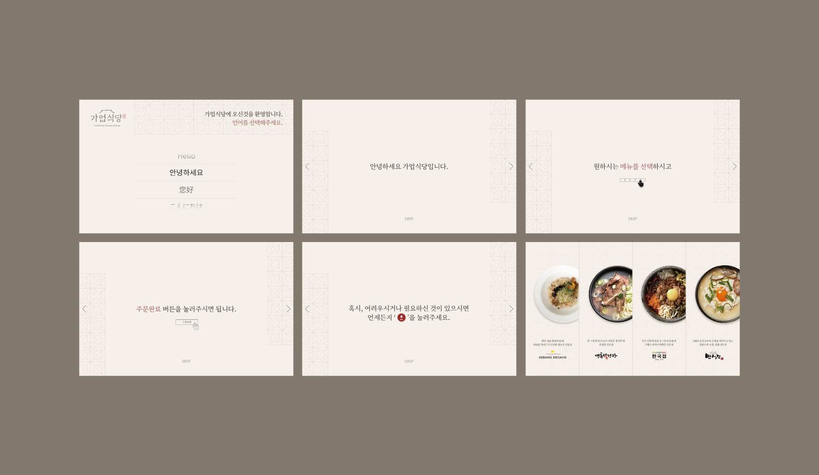 We built a concise Korean brand image to express the brand image, 'select dining,' which brought together the Korean restaurants that have been operating for generations. Also, we visualized it through various application designs such as smart pad menu pages by developing graphic motifs representing GAYEOP KOREAN DINING. We used a system of warm colors with reduced saturation and tried to create a moderate and elegant tone for the layout design to express the beauty of the east. YNL Design developed various application designs such as a basic brand identity system for GAYEOP KOREAN DINING, storytelling frame for each brand, external DID, tablet menu page (smart order page), menu, uniform, and bill.