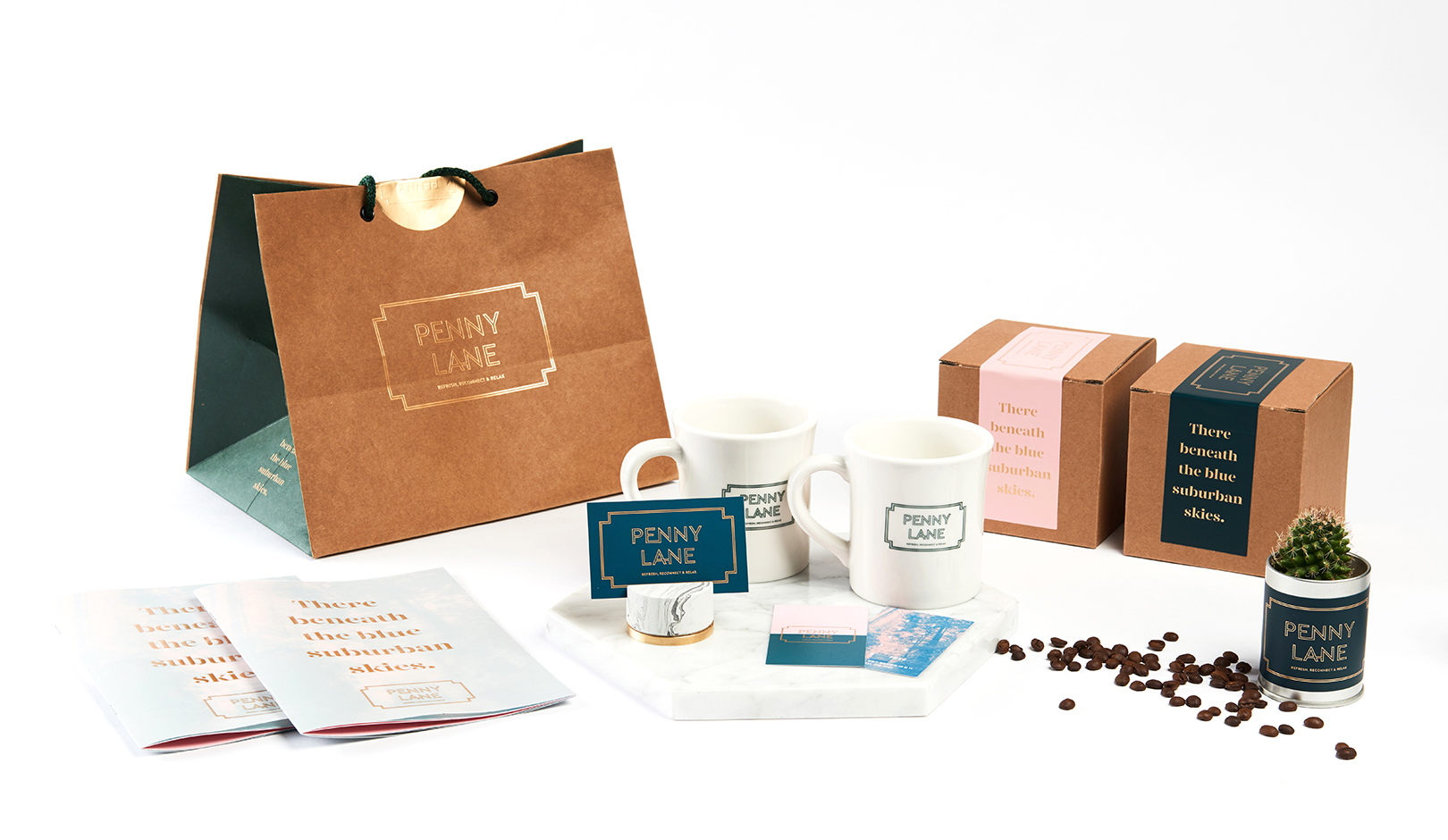 비틀즈 노래에서 영감을 받아 개발된 페니 레인의 로고는 존 레논이 어렸을때 살았던 영국 거리 사인을 모티브 삼아 개발되었습니다. 이를 파생시켜 시각적으로 보여지는 운영 용품, 서식류, 패키지류등에 적용시켜 통일성 있는 디자인으로 개발하였습니다. 페니레인 노래에 나오는 ‘There beneath the blue suburban skies’라는 가사를 은유적으로 메뉴지에 표현하고 자연친화적인 사진을 적용하여 “외곽으로 가는 힐링의 여행”이라는 컨셉을 전반적인 비주얼 아이덴티티에 담았습니다. 벽면 포스터 디자인과 사진 엽서는 소비자의 마음을 건드리는 감성적인 비주얼 요소가 되어 브랜드를 차별화시킵니다.