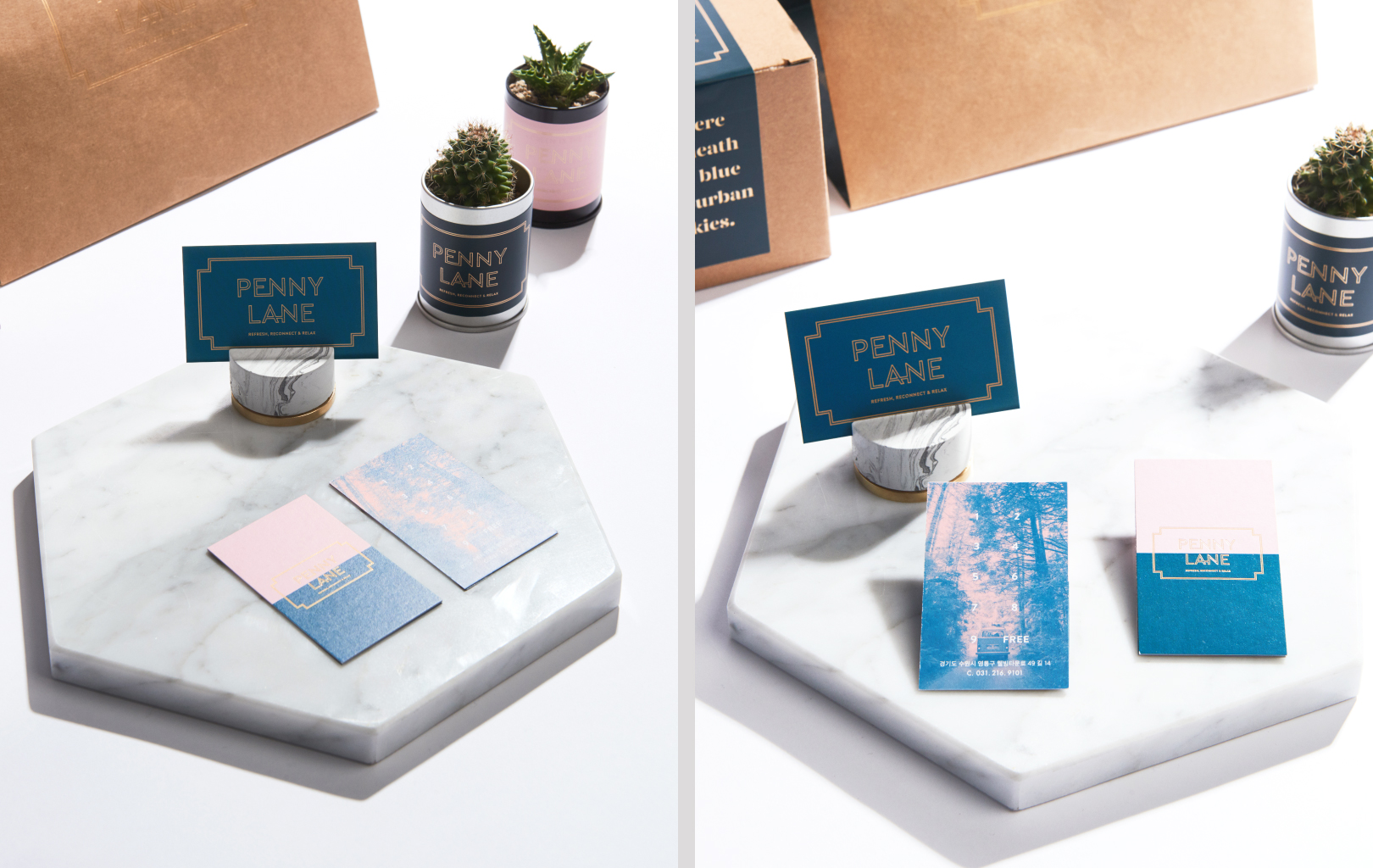 Inspired by the Beatles' song, PENNY LANE's logo was developed on the theme of street signs in the UK, where John Lennon lived during his childhood. It was derived and applied to operational supplies, forms, and packages where it is visually shown to develop a unified design. By metaphorically expressing the lyrics from PENNY LANE, ‘There beneath the blue suburban skies,' on the menu and applying nature-friendly photos, we incorporated the concept of “a healing trip to the outskirts” into the overall visual identity. Wall poster designs and postcards with images differentiated the brand as emotional visual elements that touch the hearts of consumers.