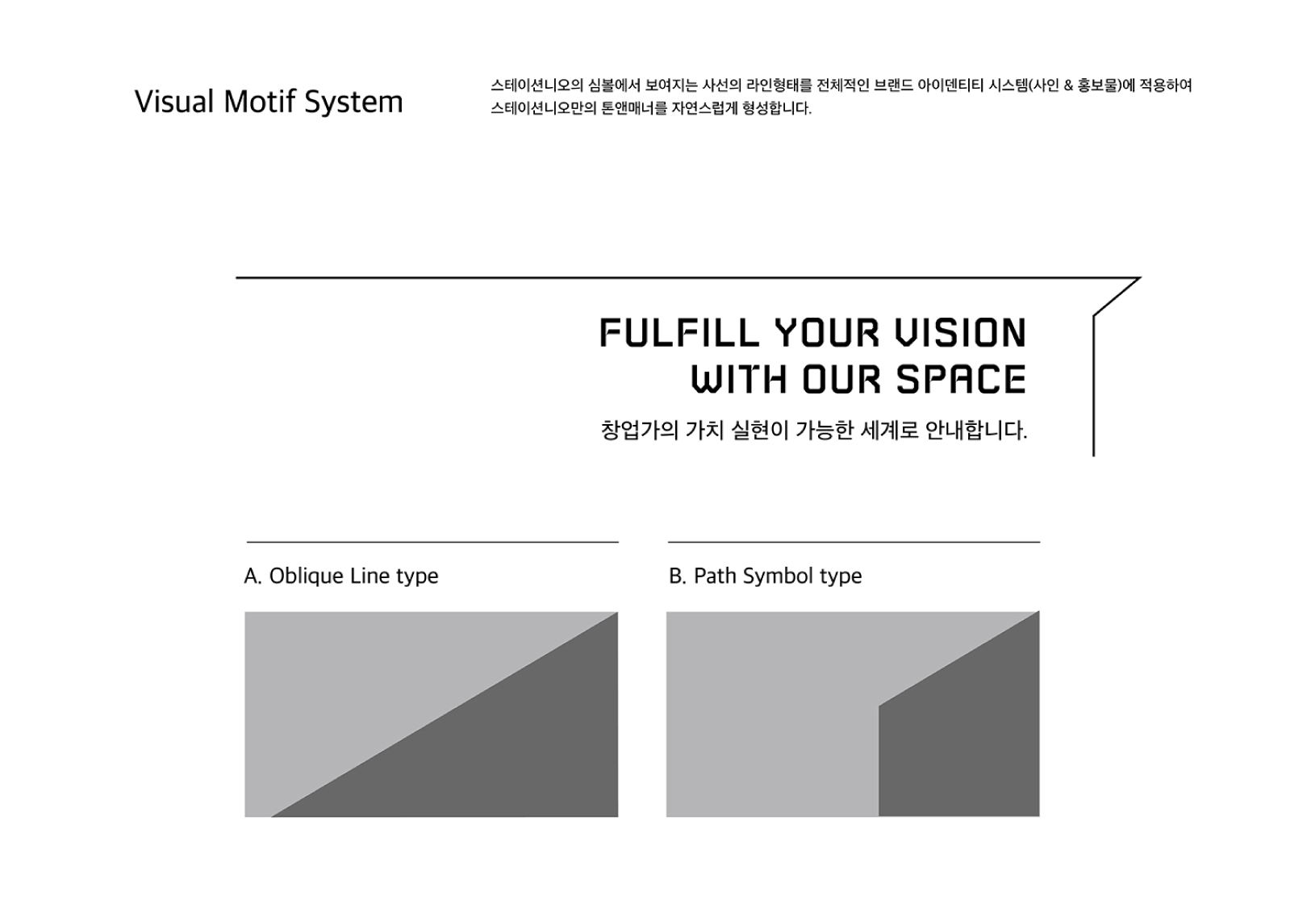 YNL Design은 ‘Guide to faster path’ (‘창업가의 가치실현이 가능한 세계로 안내합니다.’)라는 스테이션니오의 슬로건을 모티브 삼아 초기 컨셉과 로고타입을 개발하였습니다. 창업가의 가치 실현이 가능한 세계로 안내한다는 의미를 담아 문이 열리고 빛이 보이는 컨셉슈얼한 심볼을 개발하였습니다. 로고에서 보여지는 문의 의미는 즉 ‘공유’ (share)를 뜻하며 열리다는 컨셉은 ‘융합’(Fuse)을, 빛이 나오는 형상은 ‘도약’(Shift)의 의미를 담고 있습니다. 또한 심볼에서 보여지는 사선(oblique)의 라인형태를 전체적인 BI와 응용 디자인 시스템에 적용하여 스테이션니오만의 미래지향적이고 세련된 톤앤매너를 시각화하였습니다.