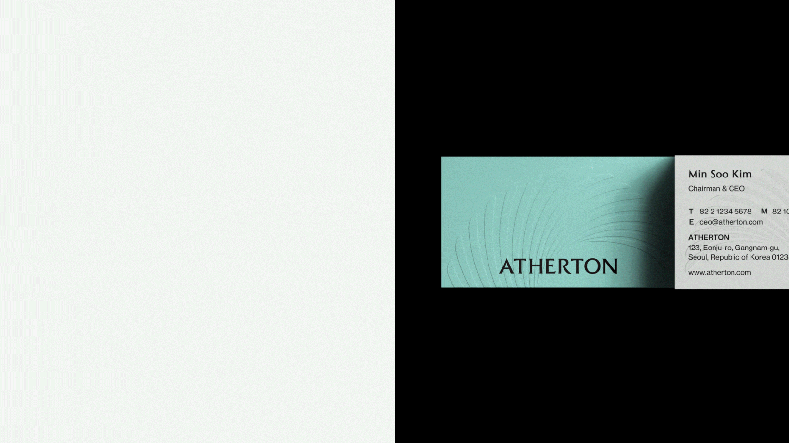 YNL은 Atherton의 브랜드 에센스를 BRING A PROSPEROUS LIFE라는 슬로건으로 정의하였으며, 이를 기반으로 Atherton의 본질적 가치를 담아낸 브랜드 아이덴티티는 개발하였습니다. 높게 상승하는 세로 라인은 다양한 건축을 통해 유니크한 라이프스타일을 만드는 Atherton의 주거 경험을 의미하며, 넓게 펼쳐진 가로 라인은 Atherton이 만드는 주거 문화를 통해 번영의 경험이 널리 확산됨을 의미합니다. 심볼에는 완만한 곡선을 사용하여 Atherton이 선사하는 풍요로운 삶을 편안하고 세련된 무드로 표현합니다. 정제된 직선의 현대적 감성과 곡선의 편안함이 조화를 이루는 Atherton의 로고타입은 주거문화를 리드하는 부동산 개발 및 컨설팅 전문 기업으로서의 자신감을 볼드하게 표현합니다. Atherton의 심볼에서 착안하여 개발된 그래픽 모티브는 더 높은 차원으로 확장되는 번영의 가치를 담았으며, Atherton이 제시하는 세련되고 풍요로운 라이프스타일을 표현했습니다. 그래픽 모티브는 어플리케이션 템플릿 사이즈에 따른 확장성과 적용성을 고려하여 다양한 고객 접점에서 일관된 브랜드 경험을 전하도록 개발했습니다. 행복과 가치있는 시간을 의미하는 에메랄드 그린 컬러와 건축물이 지닌 현대적인 무드를 담은 그레이 컬러의 조합은, Atherton이 만드는 감성적 가치와 기능적 가치가 조화를 이루는 공간을 상징합니다. 부동산 개발 및 컨설팅 기업으로서는 흔하지 않은 유니크한 에메랄드 컬러를 사용함으로써 차별성 있는 브랜드의 이미지를 전하고, 주거공간을 통해 삶에 번영을 선사한다는 기업의 미션을 세련된 무드로 재해석했습니다. 타이틀 서체는 로고타입과 유사한 무드를 지닌 고급스러운 산세리프를 활용하여 애서튼의 세련된 이미지를 전달하며, 본문 서체로는 가독성이 우수하고 모던한 감성을 지닌 산세리프 서체를 함께 사용하여 애서튼이 지닌 현대적인 세련미를 전달합니다.