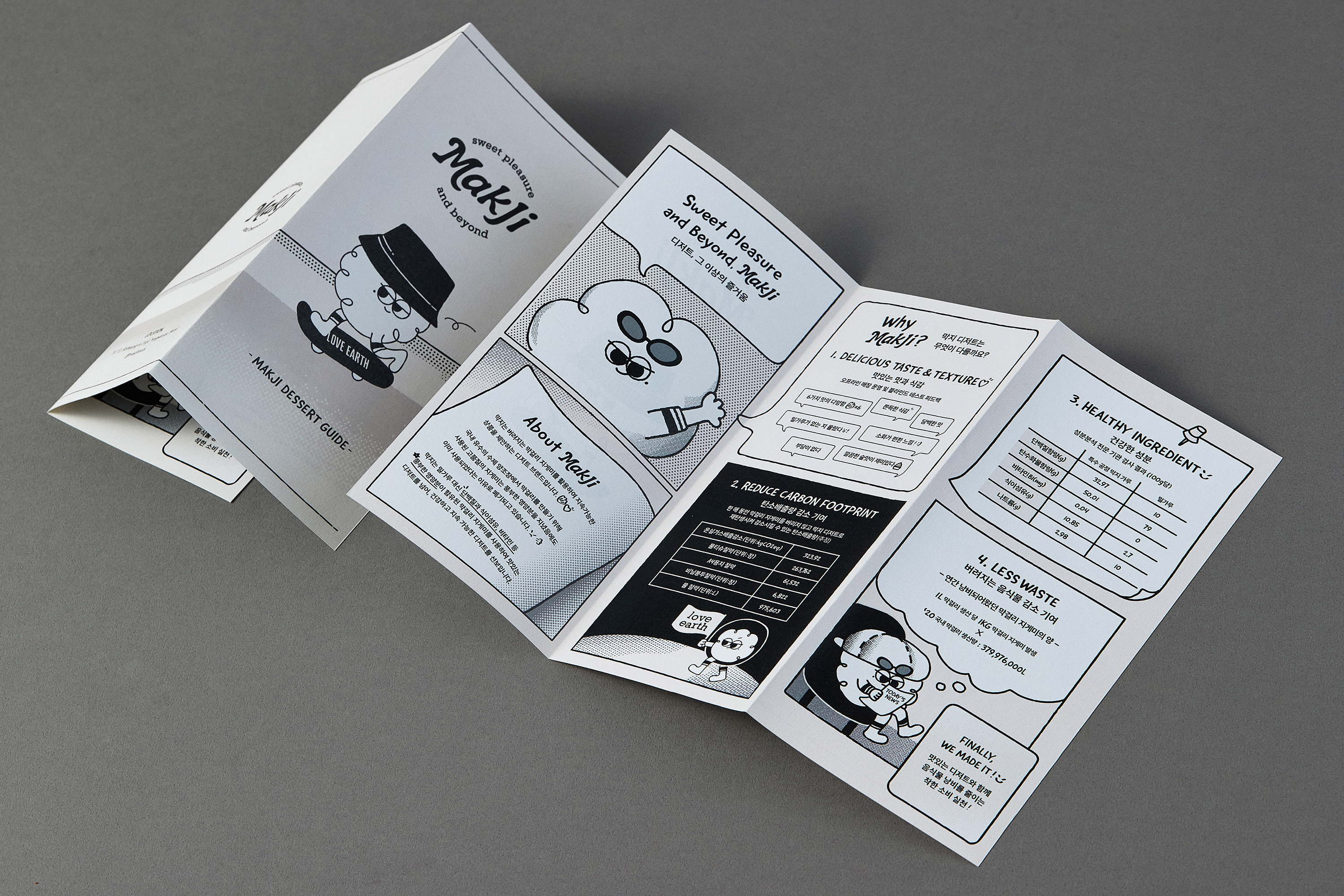 YNL Design developed the brand with an organic and premium mood visualized through a wordmark design that embodies the essence of "Healthy Pleasure." The concept of the character "Makji Gangster" represents the core concept of fighting against flour and environmental pollution to promote a healthy eating culture and protect the planet, expressing the brand value in a witty way. The package design appeals to the MZ generation by incorporating the product's features, such as NO FLOUR/NO SUGAR, into the hip daily life of Makji Gangster and cleverly expresses the brand's excellence. The design of the promotional materials, such as business cards, leaflets, brochures, etc., creatively expresses the brand story and detailed research results in a cartoon format. The color scheme consists of ivory, the main color inspired by Makgeolli Jigae, and six muted sub-colors that represent refined black and subtle flavors. YNL Design builds a unified look and feel for Makji's BI, gift packages, leaflets, brochures, stickers, tags, SNS guides, etc., to deliver the value of promoting a healthy eating culture in a more appealing way.