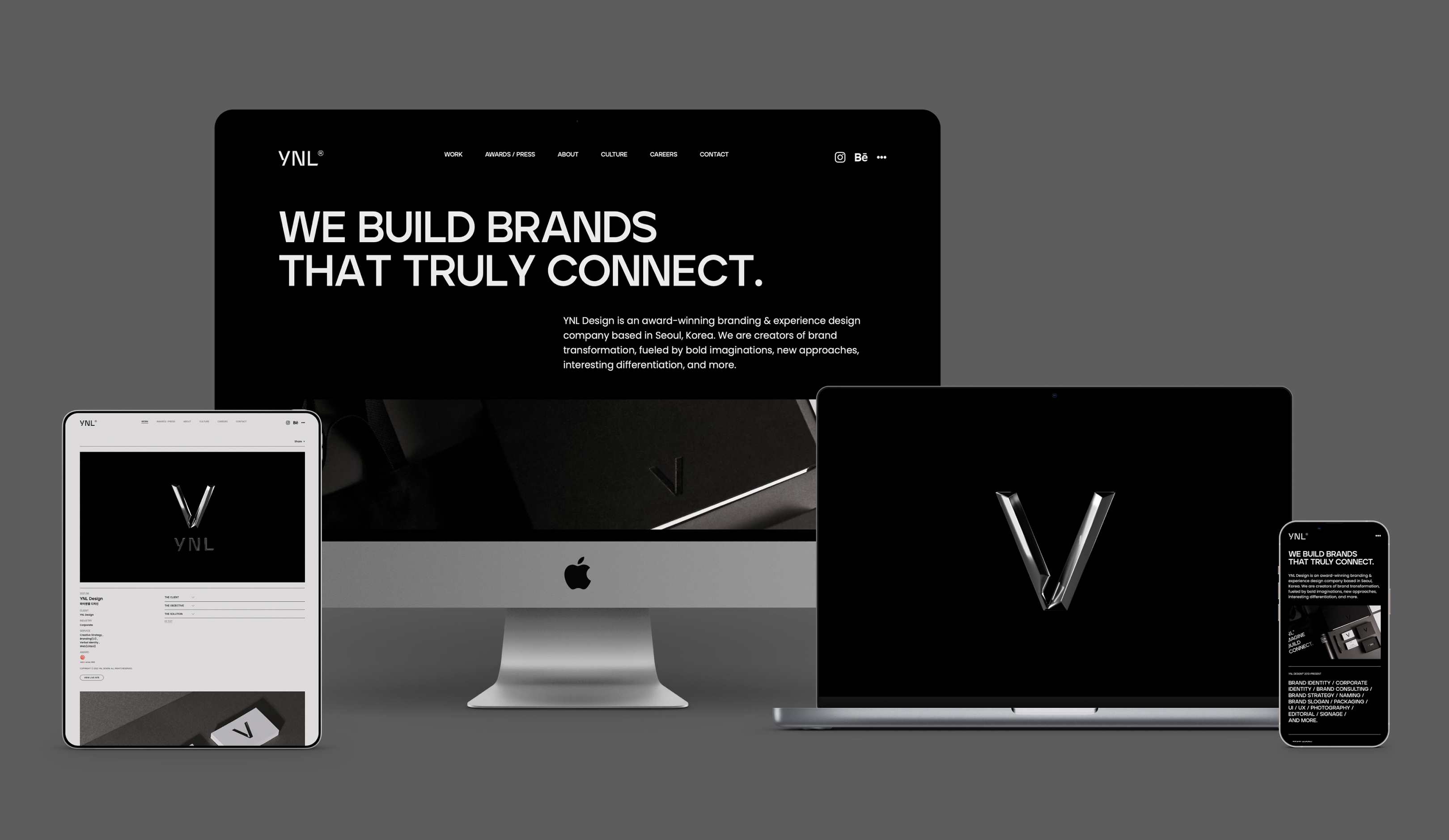 The website is simplified and organized based on a well-thought-out GRID SYSTEM to express the attitudes and values of YNL Design in a minimal and modern way, building YNL Design's own brand identity. It allows users to feel the image of a design company that changes flexibly through interaction with the changing background. By adopting a simple and intuitive menu, we improved users' accessibility. Also, we arranged the information that the client considers essential so that they can be found at a glance to convey the information concisely and clearly. We have created a system environment that eliminates unnecessary information exposure and allows users to obtain information quickly. We allowed users to move naturally through intuitive category configuration and improved convenience in user experience. On the all projects page, we presented various projects at a glance and showed the scope and scalability of YNL Design by separating industry and service sections. We made it easy for users to find information and increased user access to create an environment to learn information swiftly. The grid system used in the PC is also applied to the mobile device to provide an integrated visual experience for each device.
