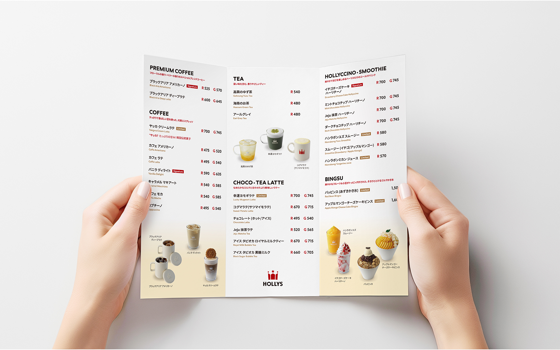The goal was to effectively highlight Hollys' diverse and attractive menu. The beverages and desserts were visualized to evoke a sense of sizzle, making them enjoyable and delicious. Additionally, the layout was designed to be flexible for easy application across various media such as stand banners, kiosks, and digital signage. To align with the mood of the Japan branch, we aimed to develop vibrant and playful visuals rather than static graphics.