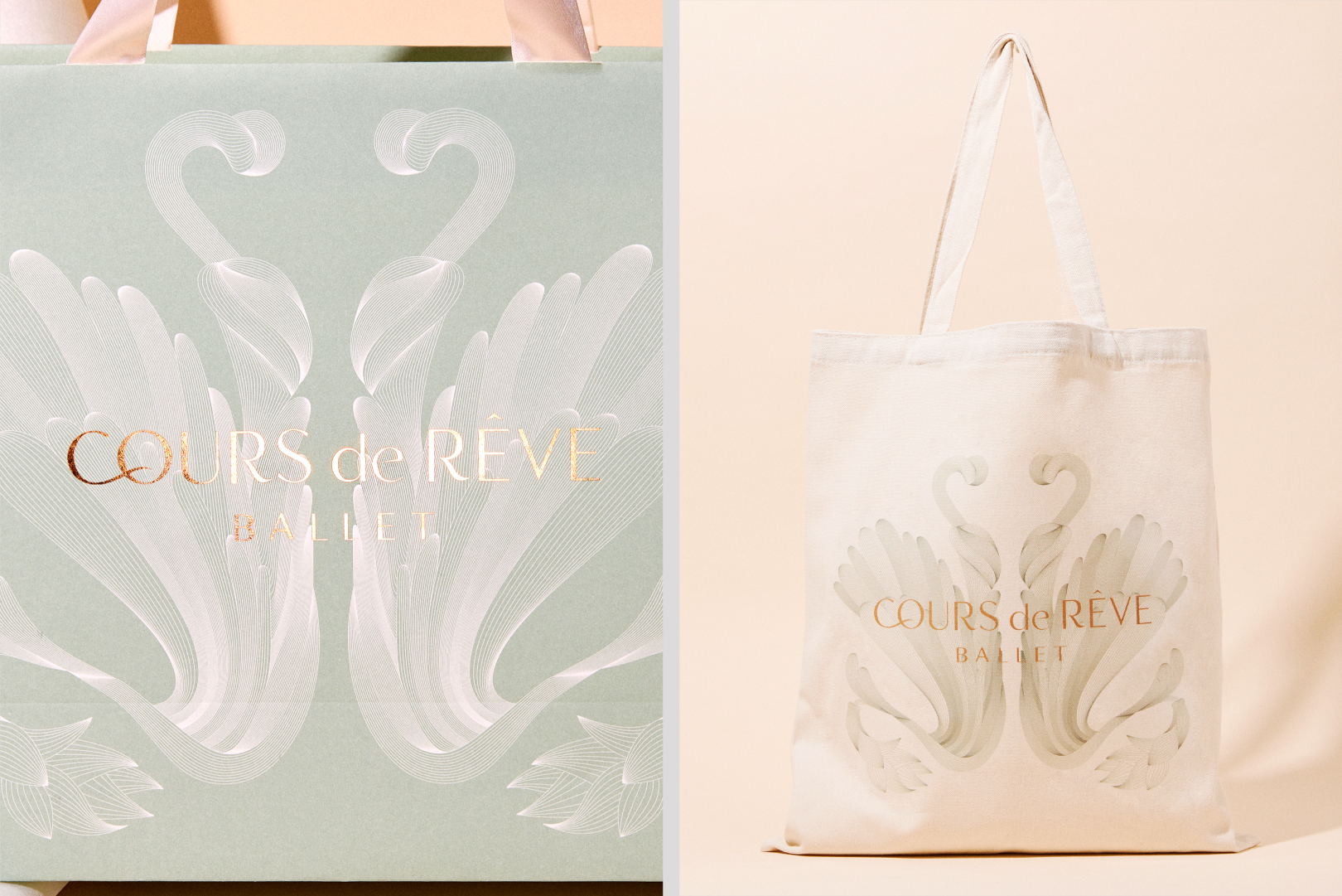 We have created a unique symbol for 'Cours de Reve' that shows the artistic lines, portraying ballerinas' graceful movements through the brand concept of 'From sensuous movement to art.' The graphic motif is inspired by "Swan Lake" of Russian ballet heritage with delicate hand drawing and elegant curved lines. The graphic motif is unique to Cours de Reve with an elegant and modern classic concept that reflects the conceptual image of a swan reflected in the water as if it were blooming like a flower.
