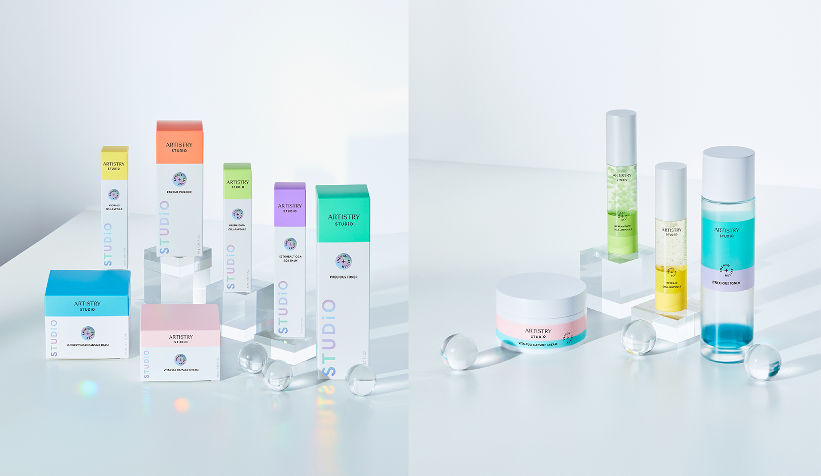 아티스트리 스튜디오는 (주)암웨이의 스킨케어 코스메틱 브랜드로 피부 속 에너지를 채우고 오염된 환경으로 지친 피부에 쉼을 주기 위한 기초 스킨케어 라인을 출시했습니다. 다양한 피부 고민을 해결하는 케어 솔루션을 제공하며 합리적인 가격대와 주목도 있는 패키지를 내세운 MZ세대 타겟 제품입니다. 피부 속 에너지와 안정을 의미하는 2가지의 컬러를 클렌징부터 보습, 피부 트러블 케어까지 총 7가지 단계 제품에 체계화하여 과감하게 표현한 패키지가 특징적입니다.