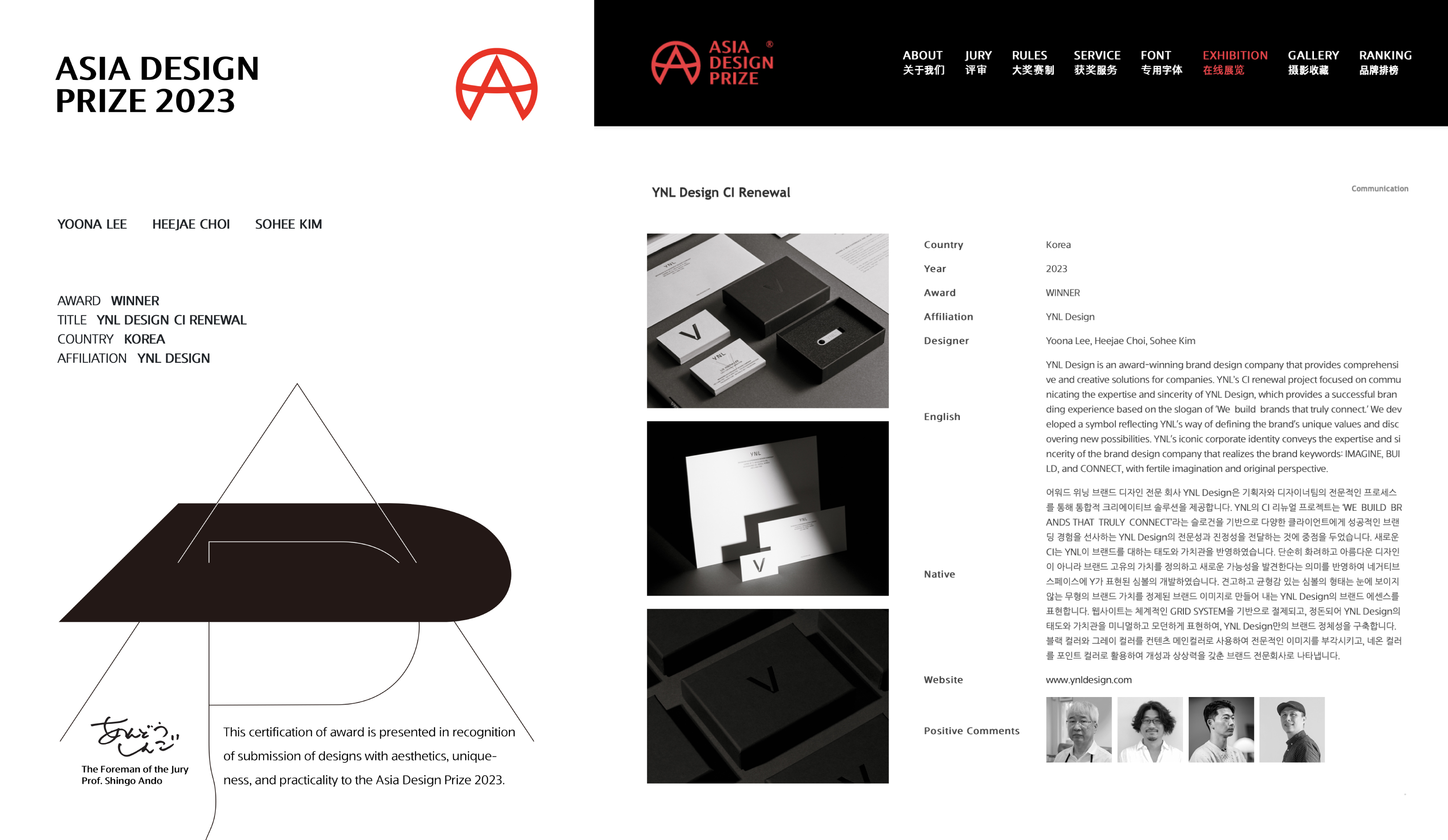 그중 YNL Design은 ‘ASIA DESIGN PRIZE 2023 (2023 아시아 디자인 어워드)’에서 총 WINNER 3개 작 (YNL Design CI Renewal – 와이앤엘 디자인 리뉴얼, Khasto – 카스토, Scott – 유한킴벌리 스카트)으로 총 3관왕을 수상하게 되는 영광을 얻었습니다.