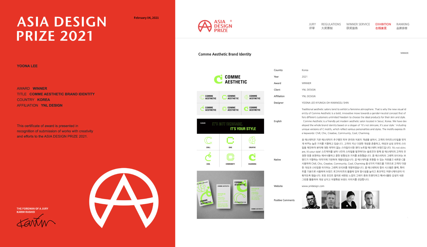 그중 YNL Design은 ‘ASIA DESIGN PRIZE 2021 (2021 아시아 디자인 어워드)’에서 총 GOLD WINNER 1개 작 (RIVER ANIMAL MEDICAL CENTER - 리버동물의료센터), WINNER 3개 작 (Grampus - 그램퍼스, COMME AESTHETIC - 꼼에스테틱, Diligent Farmer - 부지런한 농부)으로 총 4관왕을 수상하게 되는 영광을 얻었습니다.