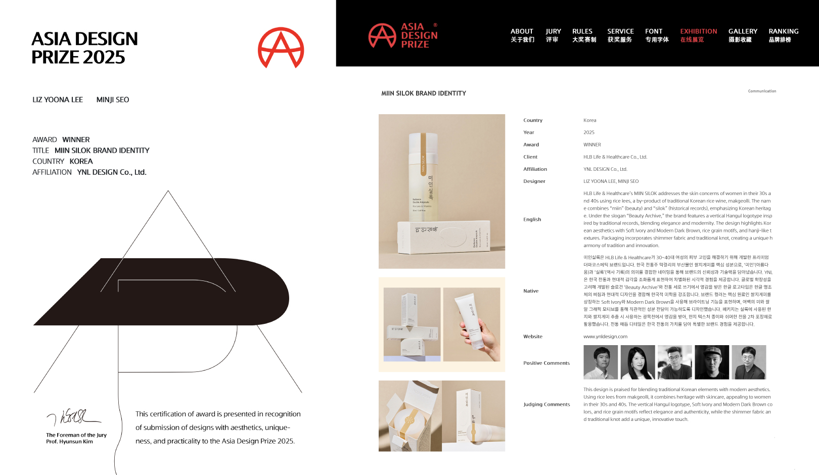 그중 ‘ASIA DESIGN PRIZE 2025 (2025 아시아 디자인 어워드)’에서 YNL Design의 'MIINSILOK - 미인실록' Brand Identity & Packaging 프로젝트가 Communication 부문에서 WINNER를 수상하게 되는 영광을 얻었습니다.