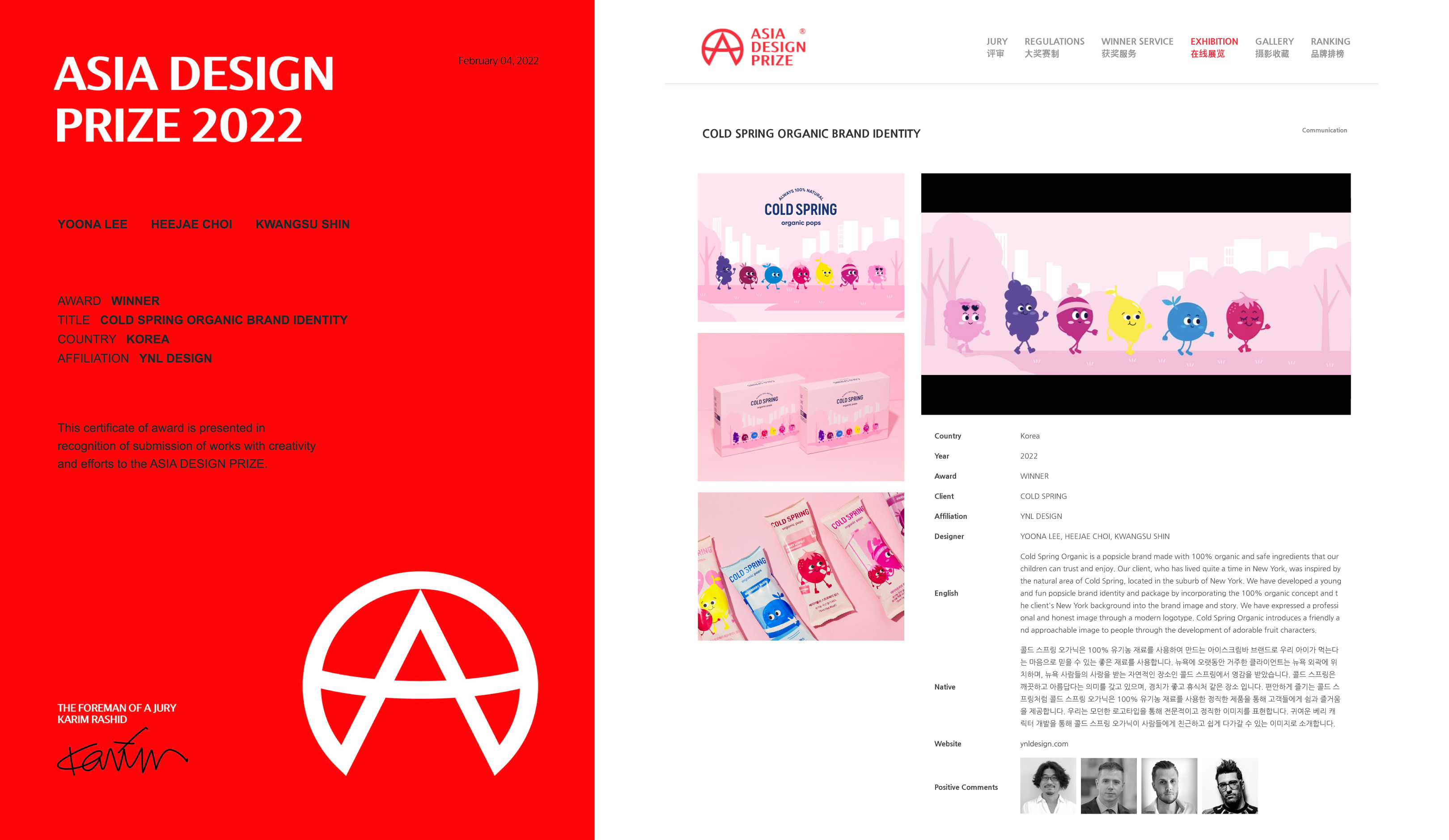 그중 YNL Design은 ‘ASIA DESIGN PRIZE 2022 (2022 아시아 디자인 어워드)’에서 총 WINNER 3개 작 (COLD SPRING ORGANIC – 콜드 스프링 오가닉, Kitsch Cow Butcher Shop - 키치카우, PRIOR – 세무법인 프라이어)으로 총 3관왕을 수상하게 되는 영광을 얻었습니다.