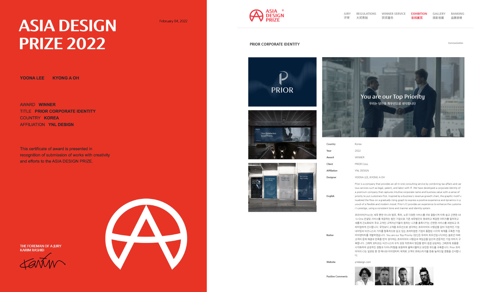 그중 YNL Design은 ‘ASIA DESIGN PRIZE 2022 (2022 아시아 디자인 어워드)’에서 총 WINNER 3개 작 (COLD SPRING ORGANIC – 콜드 스프링 오가닉, Kitsch Cow Butcher Shop - 키치카우, PRIOR – 세무법인 프라이어)으로 총 3관왕을 수상하게 되는 영광을 얻었습니다.