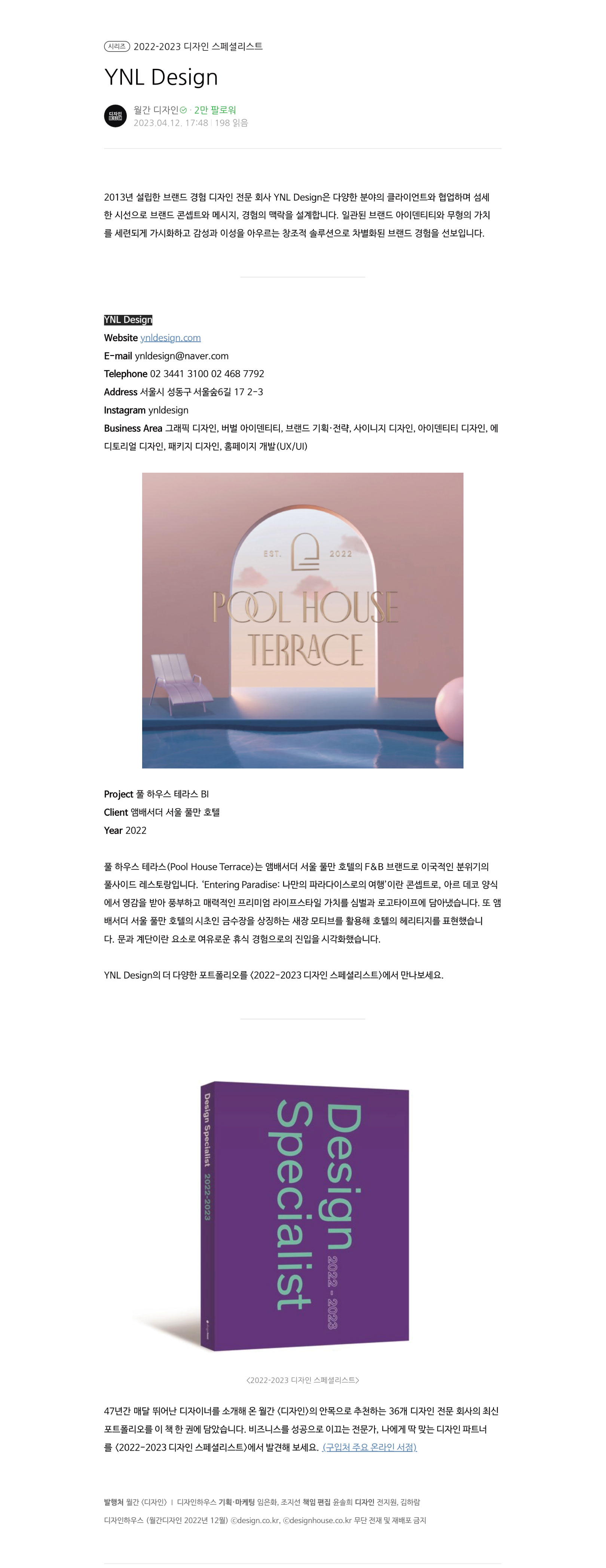 ‘MONTHLY DESIGN NAVER POST (월간 디자인 네이버 포스트)’에 YNL Design이 소개되었습니다. 월간 디자인의 ‘Design Specialist 2022-2023 (디자인 스페셜리스트 2022-2023)’에 YNL Design의 주요 프로젝트 작품들이 실려있으며, 격년으로 발행되는 ‘Design Specialist (디자인 스페셜리스트)’는 디자인이 필요한 기업, 브랜드, 사람 모두가 믿고 펼쳐 볼 수 있으며 분야별 국내 디자인 전문 회사의 소개와 포트폴리오들이 소개되어있습니다.