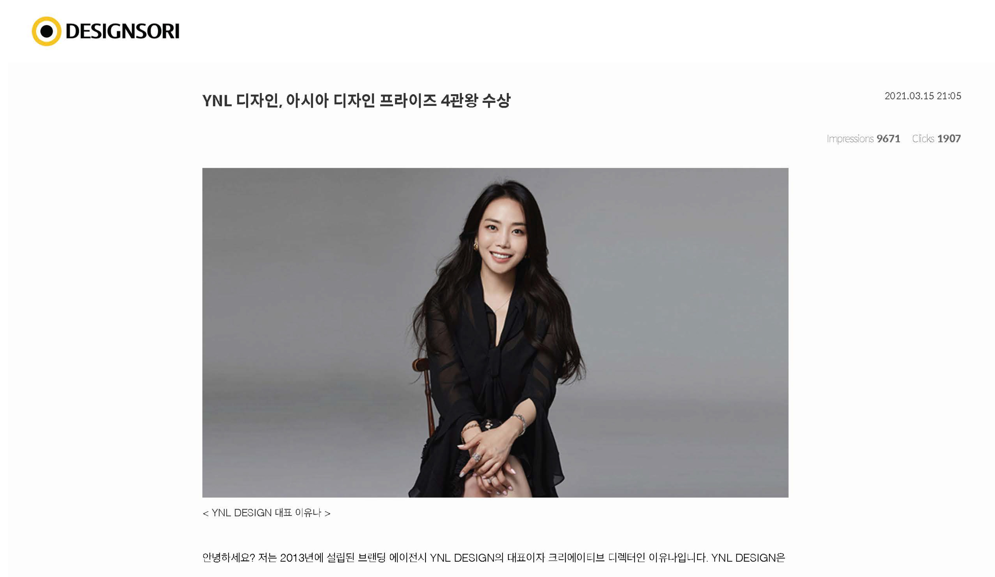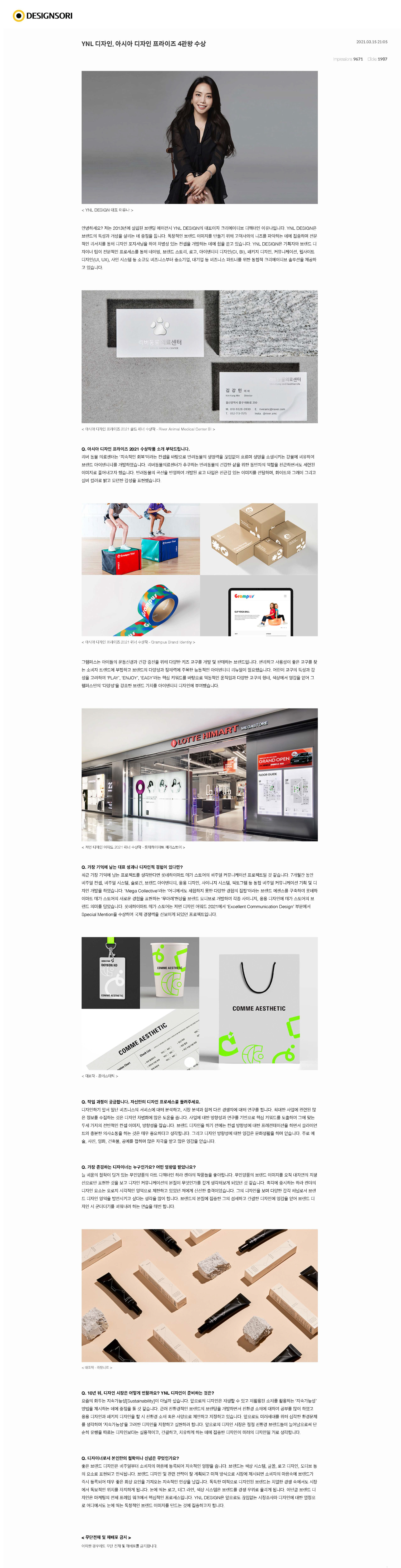 YNL Design은 ‘ASIA DESIGN PRIZE 2021 (2021 아시아 디자인 어워드)’에서 총 GOLD WINNER 1개 작 (RIVER ANIMAL MEDICAL CENTER - 리버동물의료센터), WINNER 3개 작 (GRAMPUS - 그램퍼스, COMME AESTHETIC - 꼼에스테틱, Diligent Farmer - 부지런한 농부)으로 총 4관왕을 수상하며, ‘DESIGNSORI (디자인소리)’와 인터뷰를 진행했습니다.