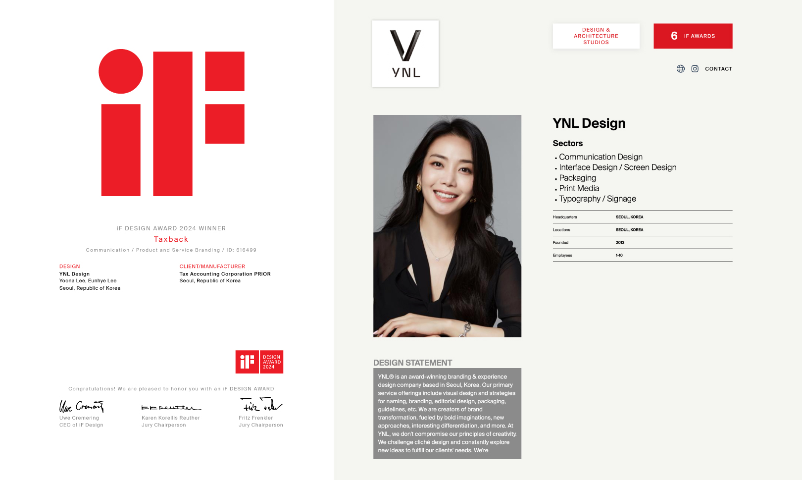 YNL Design의 ‘Taxback (텍스백)’ Brand Identity 프로젝트가 독일 ‘iF Design Award 2024 (2024 iF 디자인 어워드)' Branding 부문에서 본상 (WINNER, 위너)을 수상하였습니다.