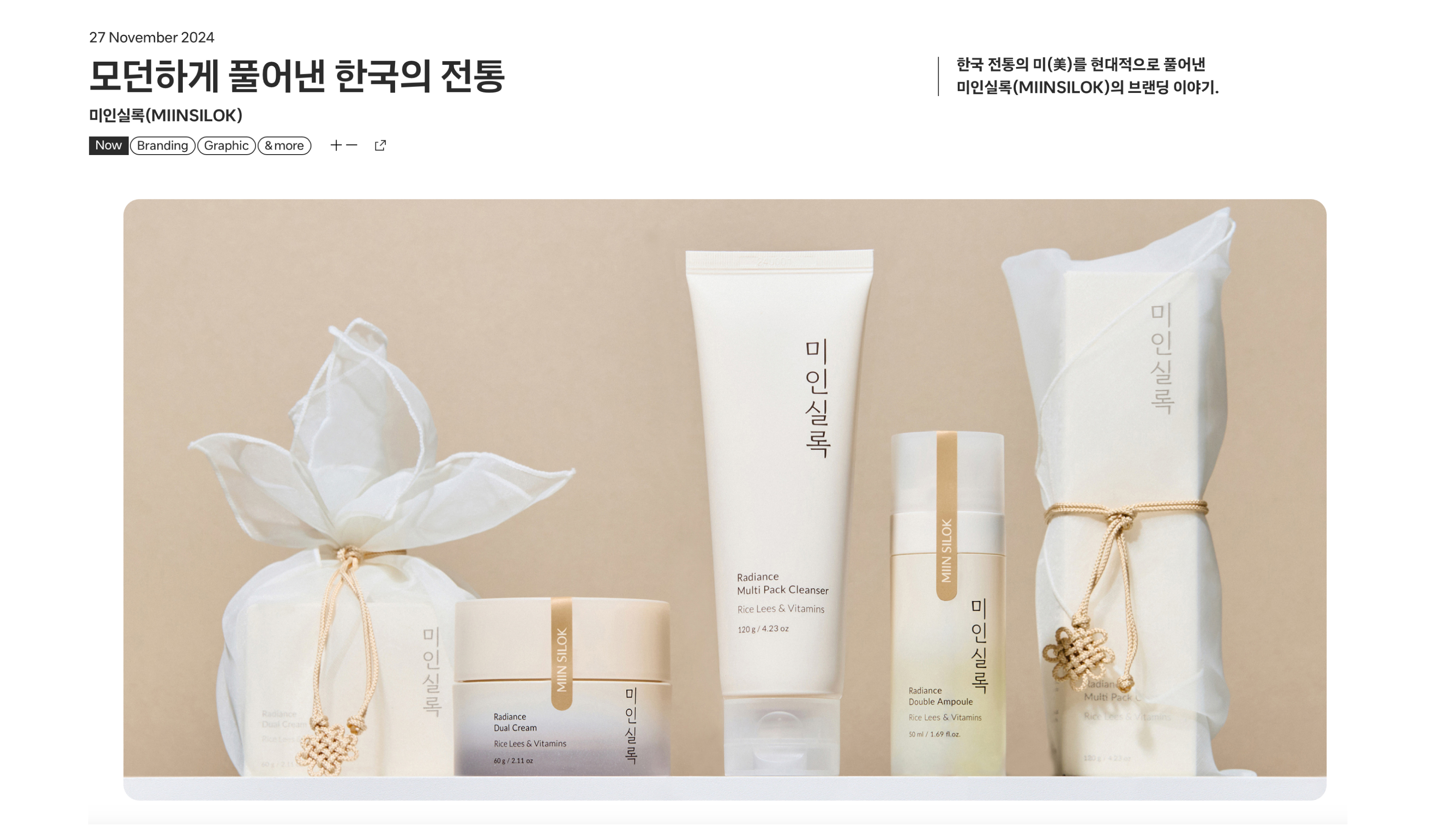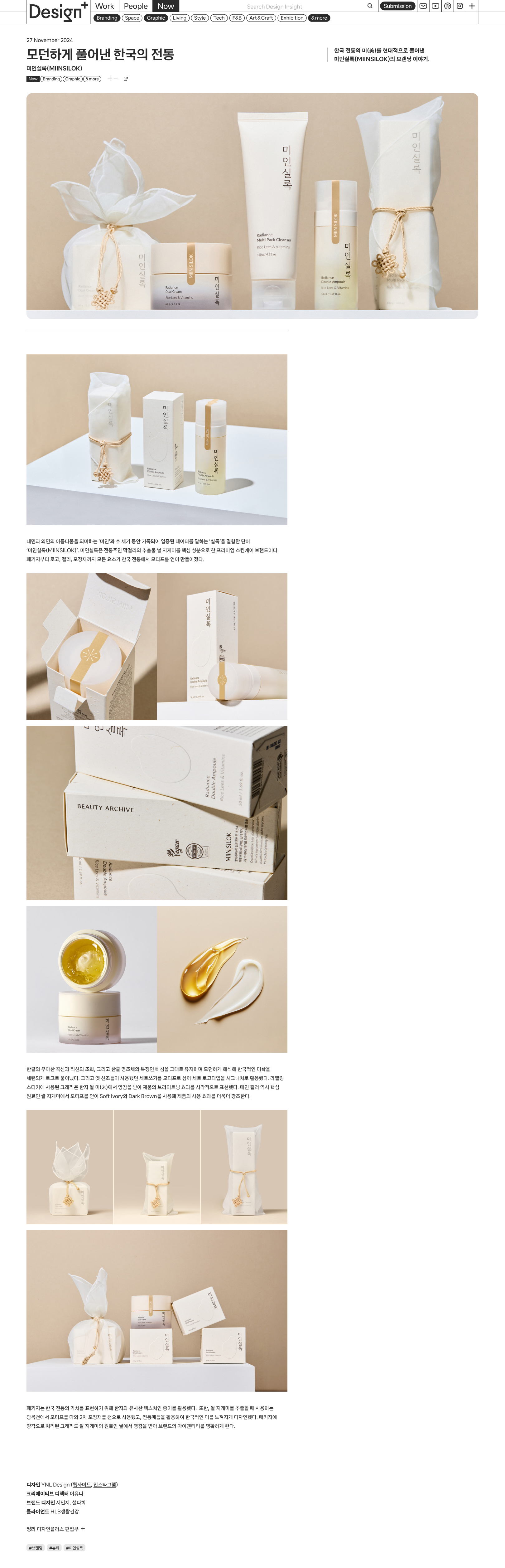 'DESIGN+'에서 YNL Design의 ‘미인실록 브랜드아이덴티티&패키지디자인 (MIINSILOK Brand Identity & Package Design)’ 프로젝트가 소개되었습니다.