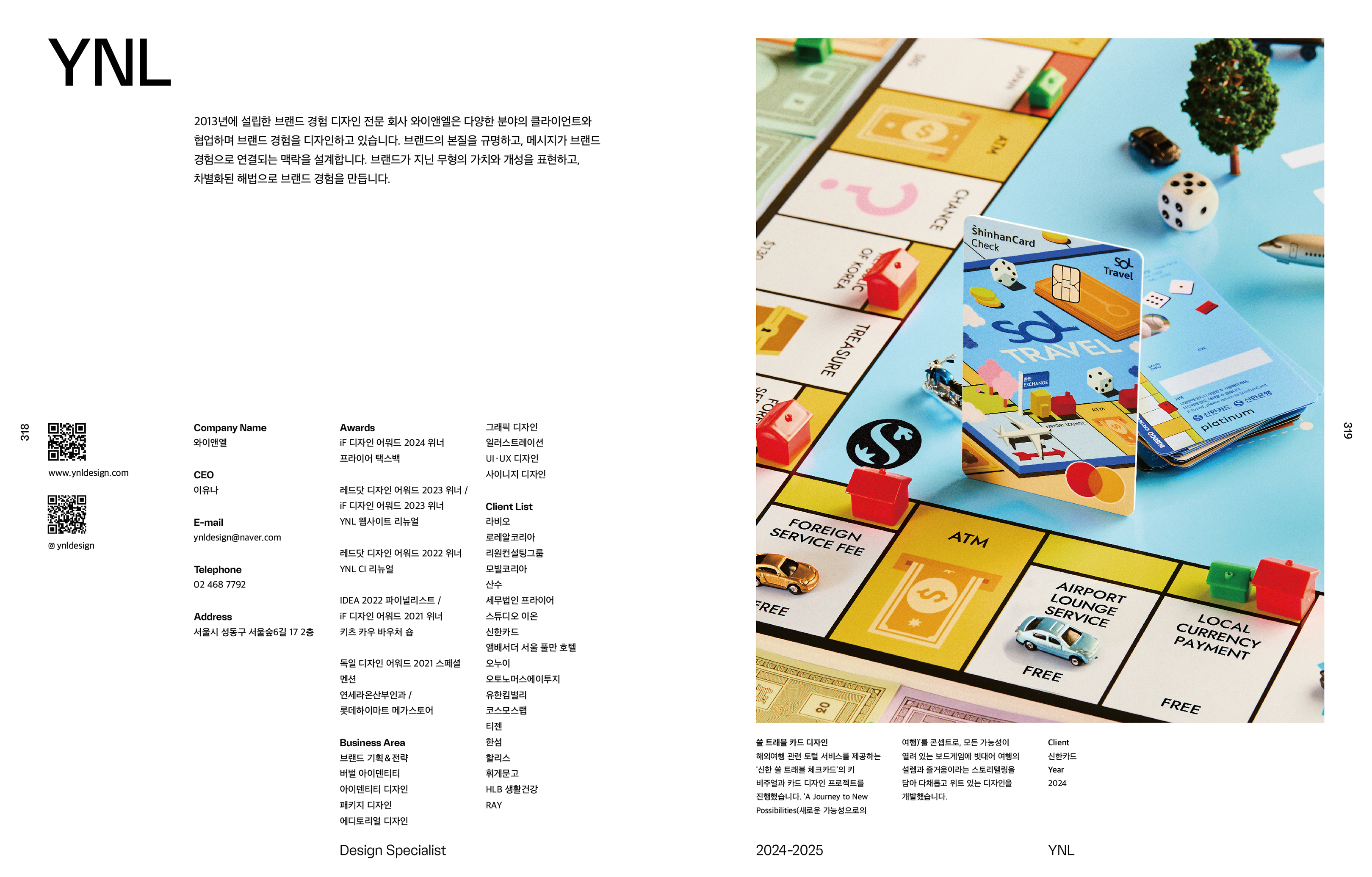 월간 디자인의 ‘Design Specialist 2024-2025 (디자인 스페셜리스트 2024-2025)’에 YNL Design의 주요 프로젝트 작품들이 실리게 되었습니다. 격년으로 발행되는 ‘Design Specialist (디자인 스페셜리스트)’는 디자인이 필요한 기업, 브랜드, 사람 모두가 믿고 펼쳐 볼 수 있으며 분야별 국내 디자인 전문 회사의 소개와 포트폴리오들이 소개되어있습니다.