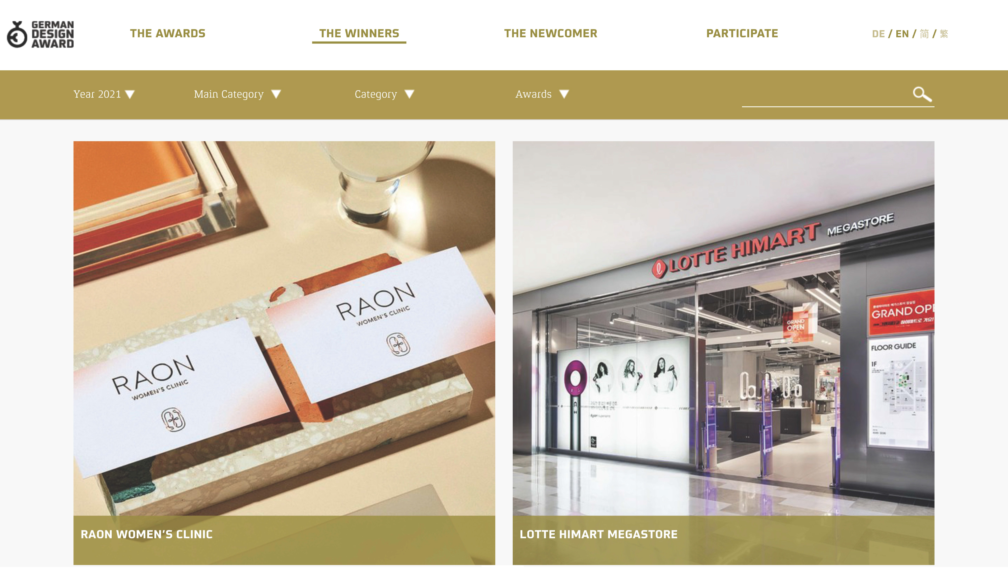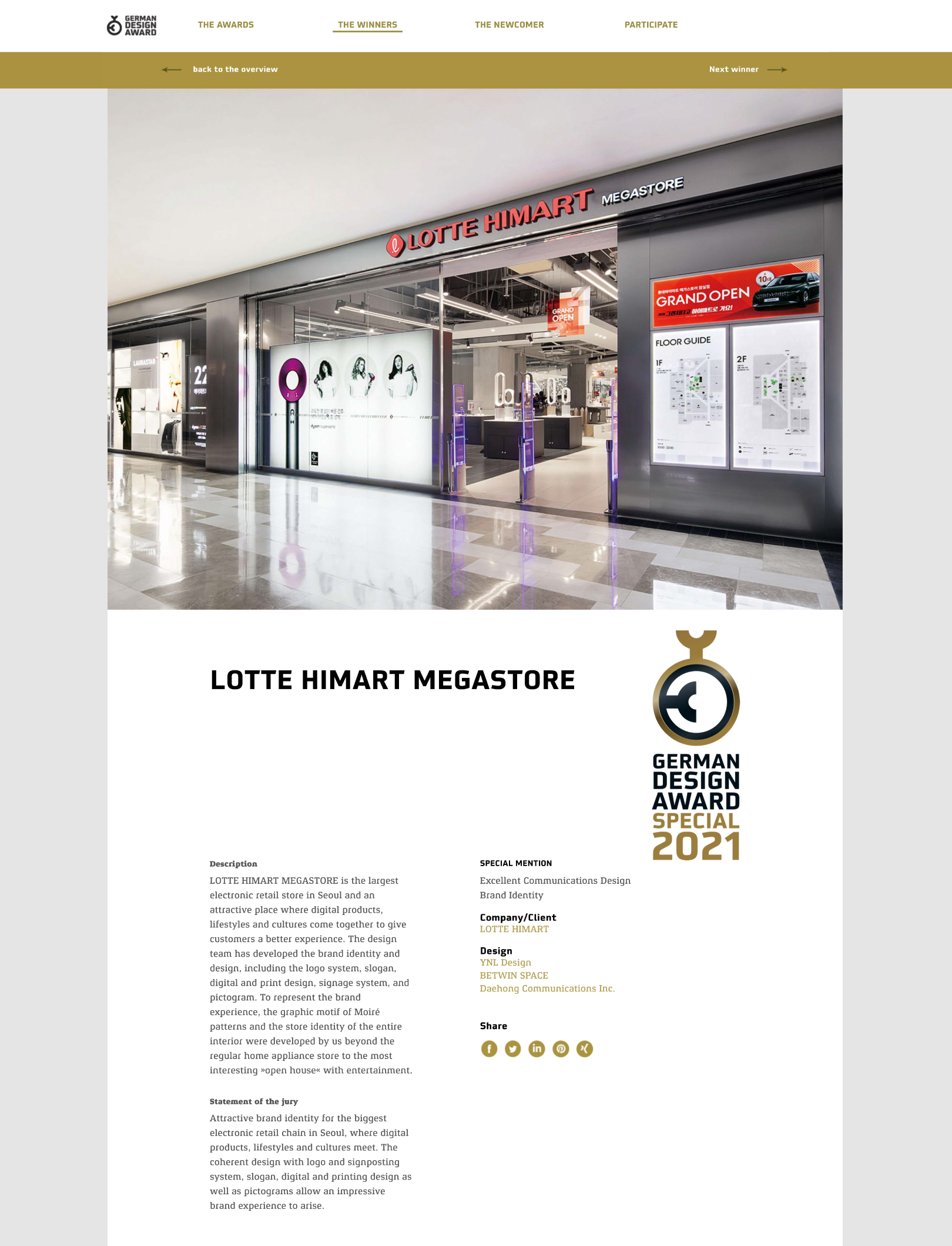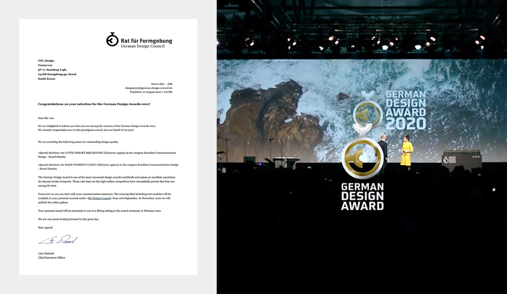 ‘GERMAN DESIGN AWARD 2021 (2021 독일 디자인 어워드)’에서 YNL Design의 ‘RAON WOMEN’S CLINIC (연세라온산부인과)’과 ‘LOTTE HIMART MEGASTORE (롯데 하이마트 메가스토어)’ Brand Identity 프로젝트가 Excellent Communications Design 부문에서 본상 (SPECIAL MENTION, 스페셜 멘션)을 수상하였습니다.