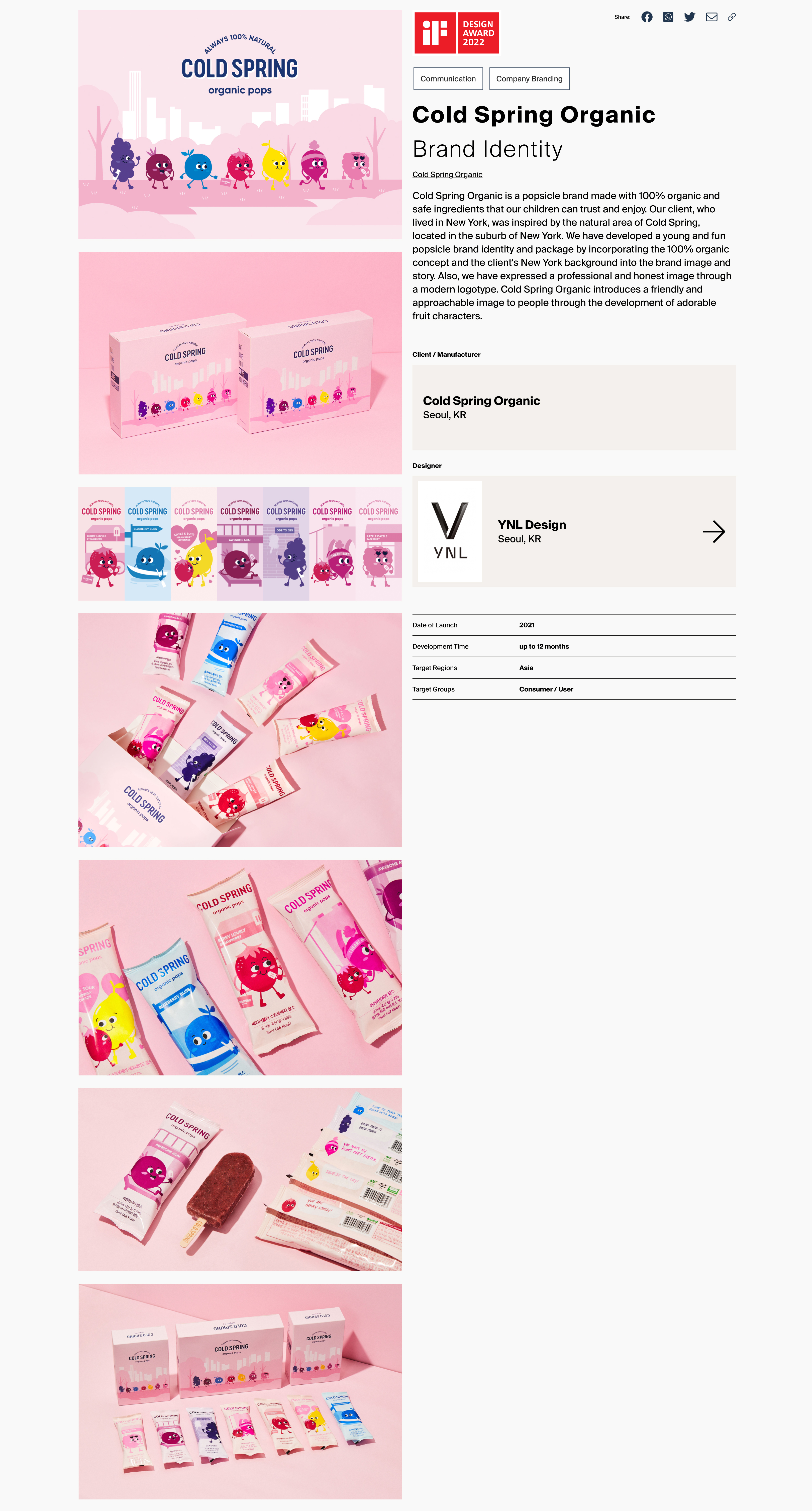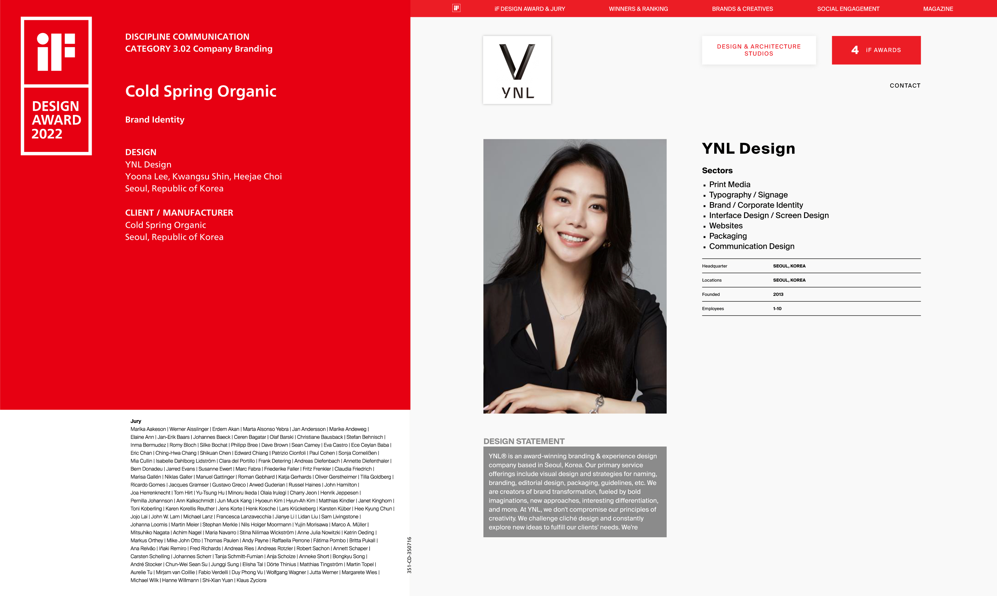 YNL Design의 ‘COLD SPRING ORGANIC (콜드 스프링 오가닉)’ Brand Identity 프로젝트가 독일 ‘iF Design Award 2022 (2022 iF 디자인 어워드)' Communication Design 부문에서 본상 (WINNER, 위너)을 수상하였습니다.