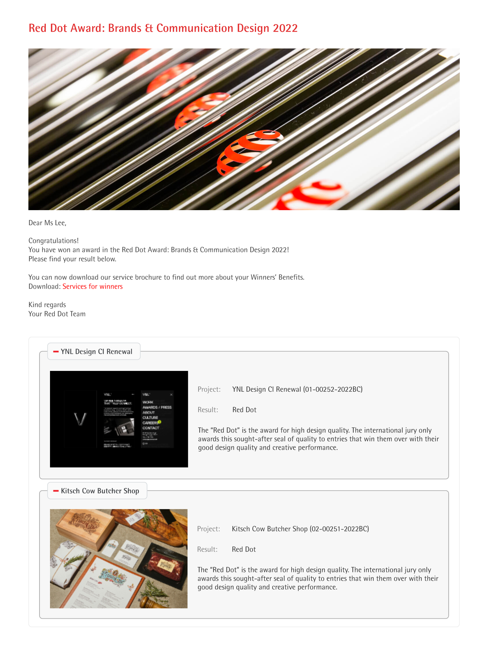 YNL Design의 ‘YNL Design CI Renewal (와이엔엘디자인)’ Corporate Identity와 ‘Kitsch Cow Butcher Shop (키치카우)' Brand Identity 프로젝트가 독일 ‘reddot design award 2022 (2022 레드닷 디자인 어워드)’ Brand & Communication 부문에서 본상 (WINNER, 위너)을 수상하였습니다.