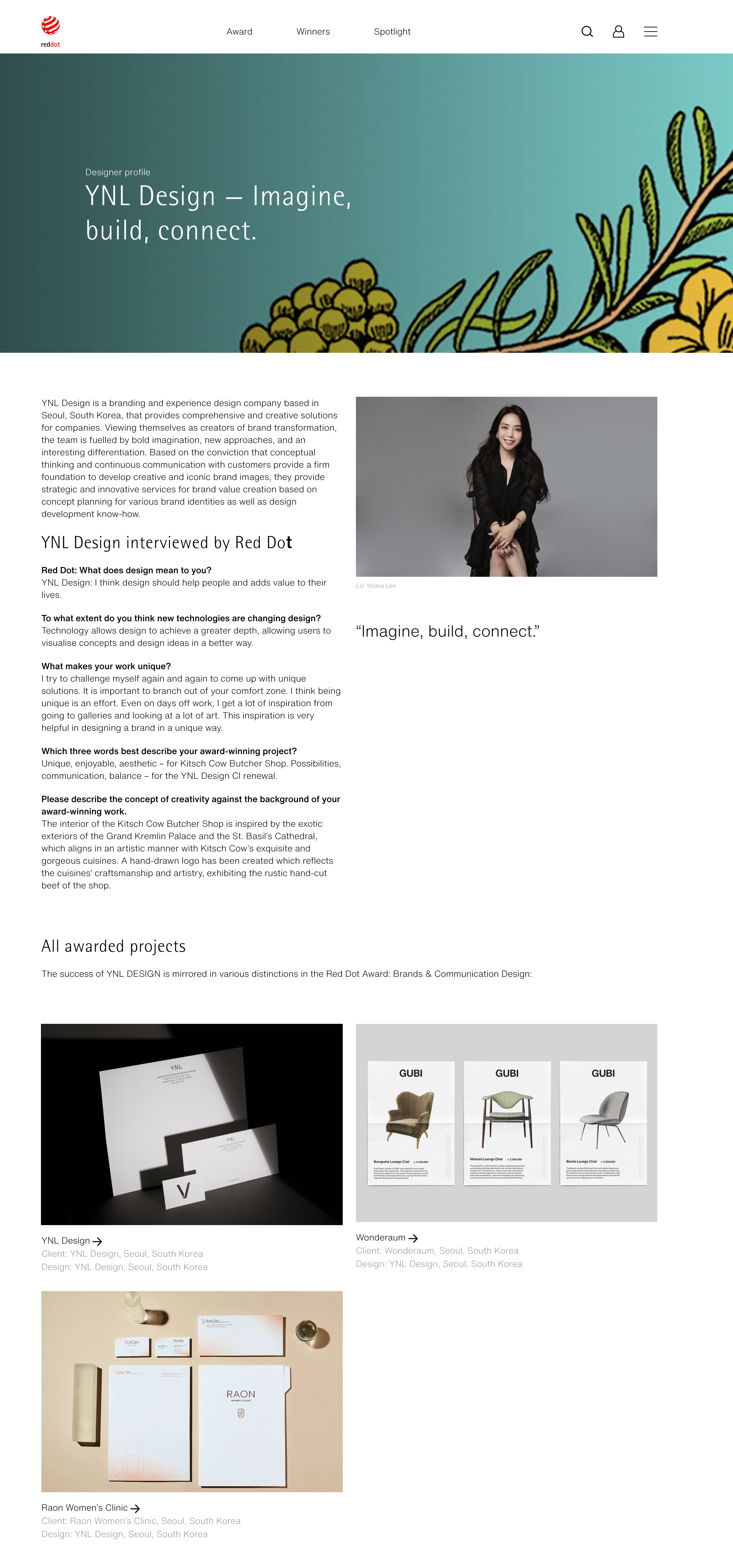 또한 reddot award 브랜드 & 커뮤니케이션 디자인 2022 올해 최고의 디자이너와 기획사를 소개하는 프로필에 YNL Design이 소개 되었습니다. 현재와 미래에 디자인 업계에 대한 이야기와 함께 창의적인 커뮤니케이션 전략에 대한 이야기를 담고 있습니다.