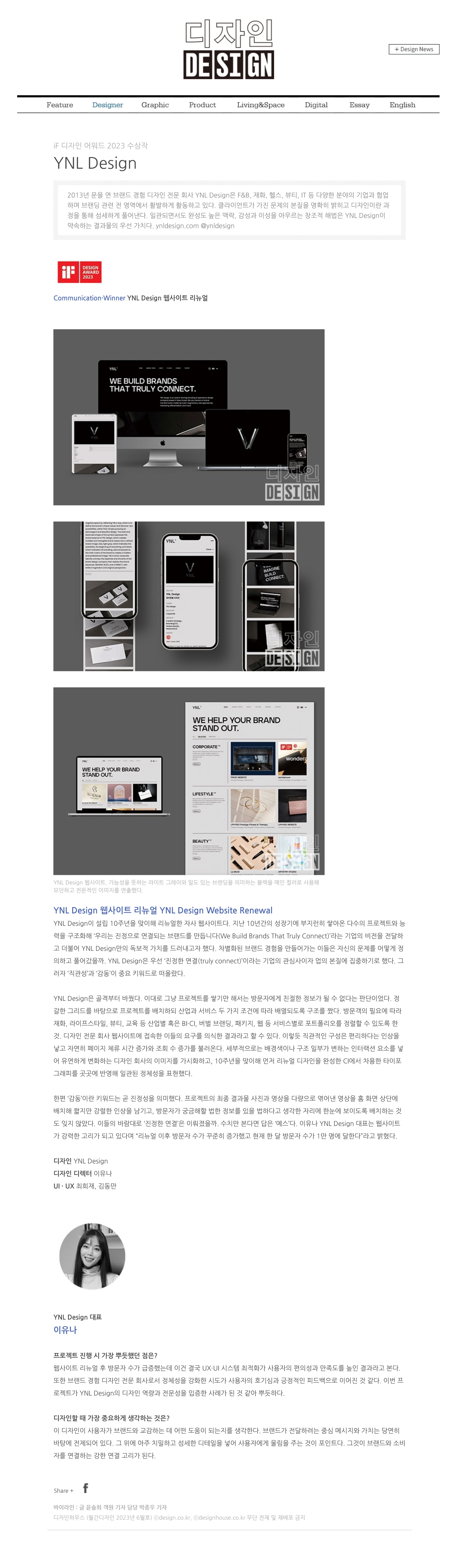 '월간 디자인 2022년 6월 호’에서 소개된 ‘iF DESIGN AWARD 2023 (2023 iF 디자인 어워드)’ Communication Design 부문에서 본상 (WINNER, 위너)을 수상한 ‘YNL Design Website Renewal (YNL Design 웹사이트 리뉴얼)’에 대한 수상 정보 및 인터뷰 내용이 ‘MONTHLY DESIGN NAVER POST (월간 디자인 네이버 포스트)’에 포스팅 되었습니다.