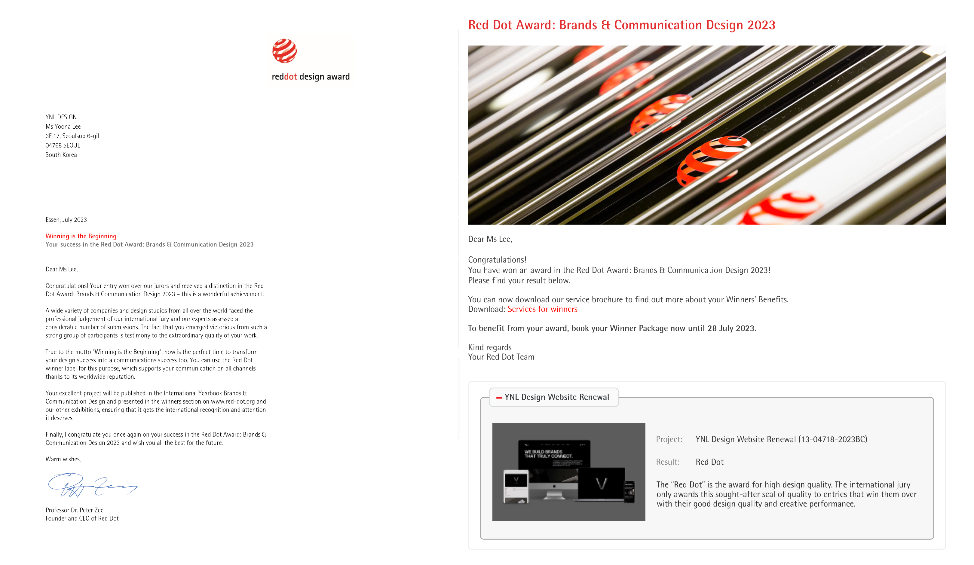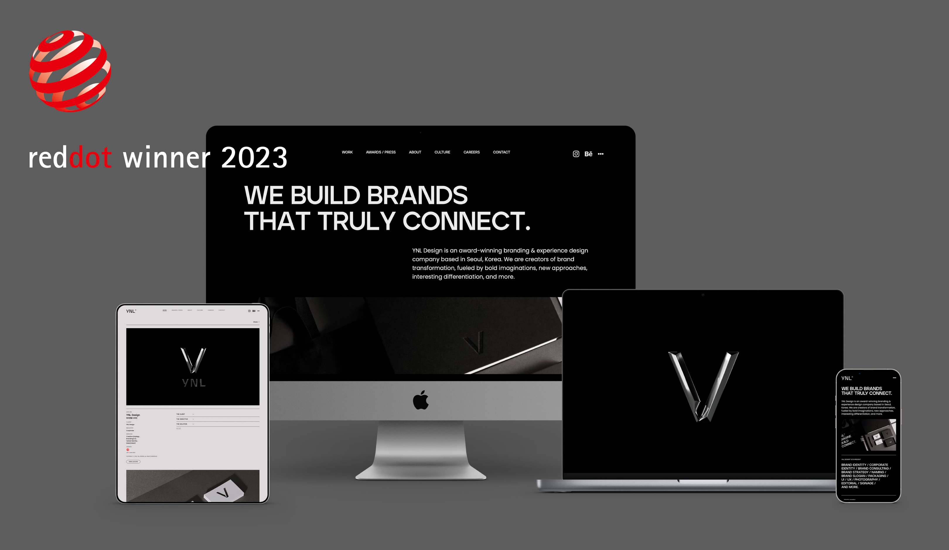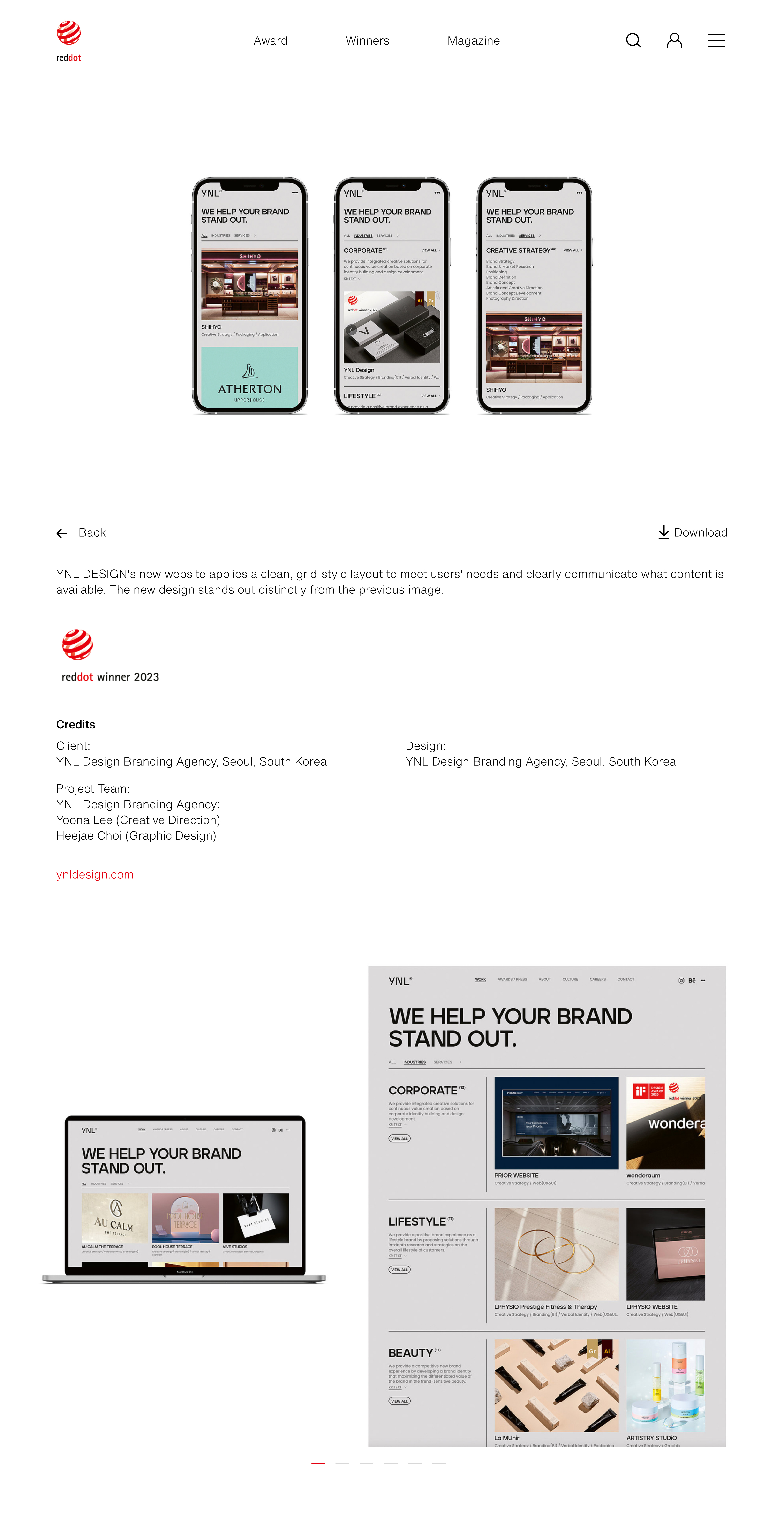 YNL Design의 ‘YNL Design Website Renewal (YNL Design 웹사이트 리뉴얼)’ Brand Identity 프로젝트가 독일 ‘reddot design award 2023 (2023 레드닷 디자인 어워드)’ Brand & Communication 부문에서 본상 (WINNER, 위너)을 수상하였습니다.