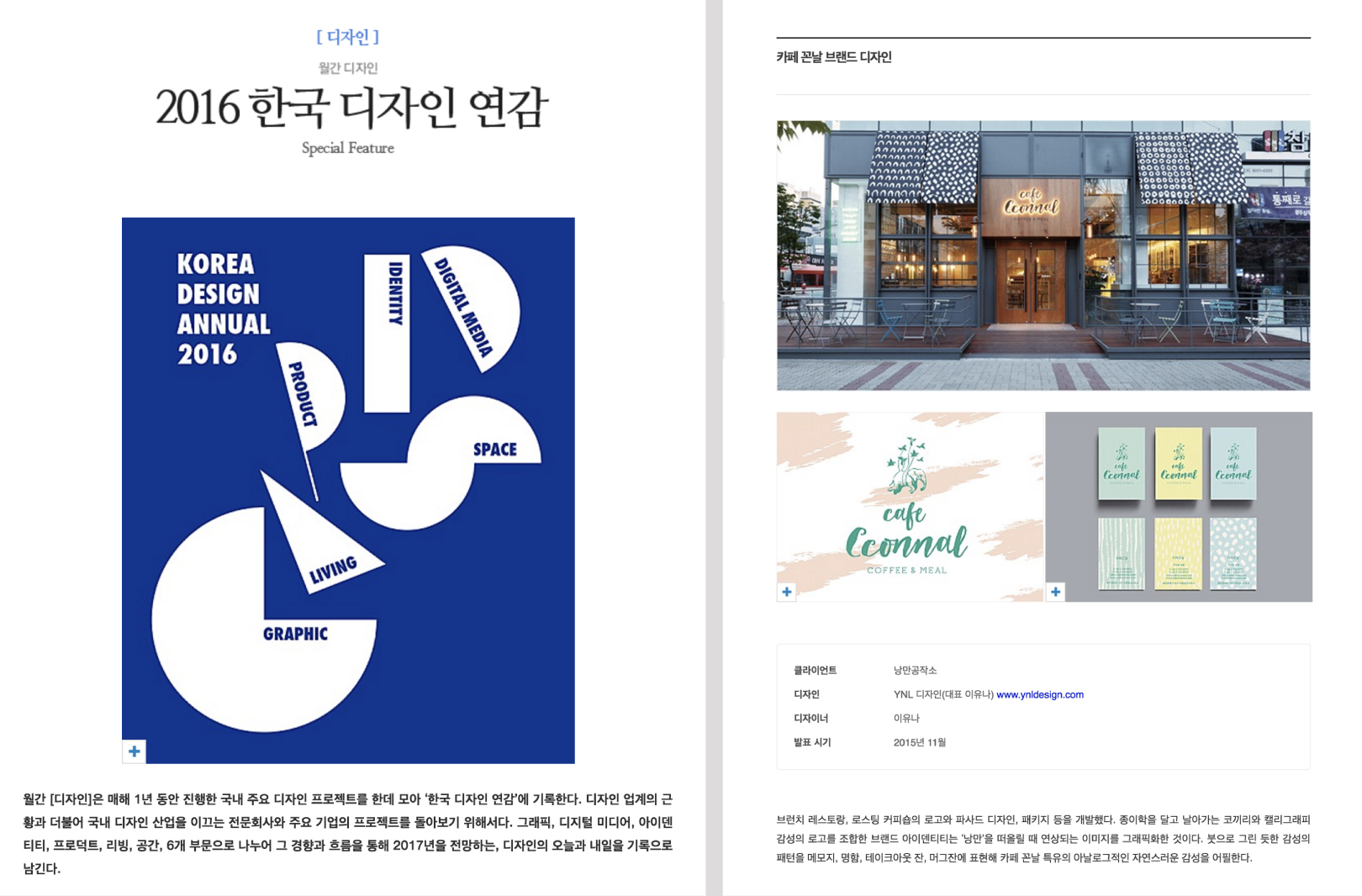‘월간 디자인 2016년 12월 호 – Korea Design Award & Korea Design Annual 2016 (2016 코리아 디자인 어워드 & 한국 디자인 연감)’ Brand Identity 부문에 YNL Design의 ‘Café Cconnal (카페 꼰날)’ Brand Identity 프로젝트가 소개되었습니다.