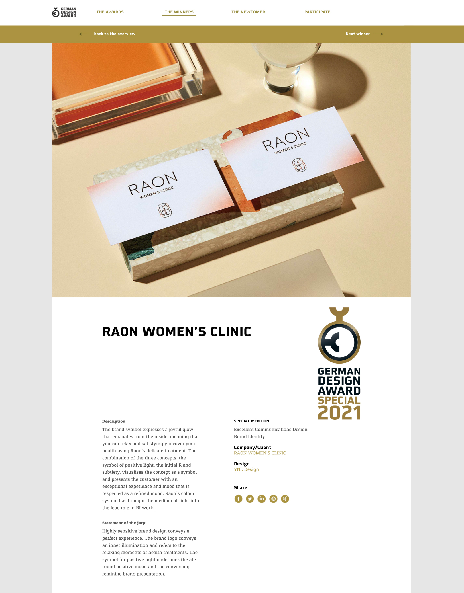 ‘GERMAN DESIGN AWARD 2021 (2021 독일 디자인 어워드)’에서 YNL Design의 ‘RAON WOMEN’S CLINIC (연세라온산부인과)’과 ‘LOTTE HIMART MEGASTORE (롯데 하이마트 메가스토어)’ Brand Identity 프로젝트가 Excellent Communications Design 부문에서 본상 (SPECIAL MENTION, 스페셜 멘션)을 수상하였습니다.