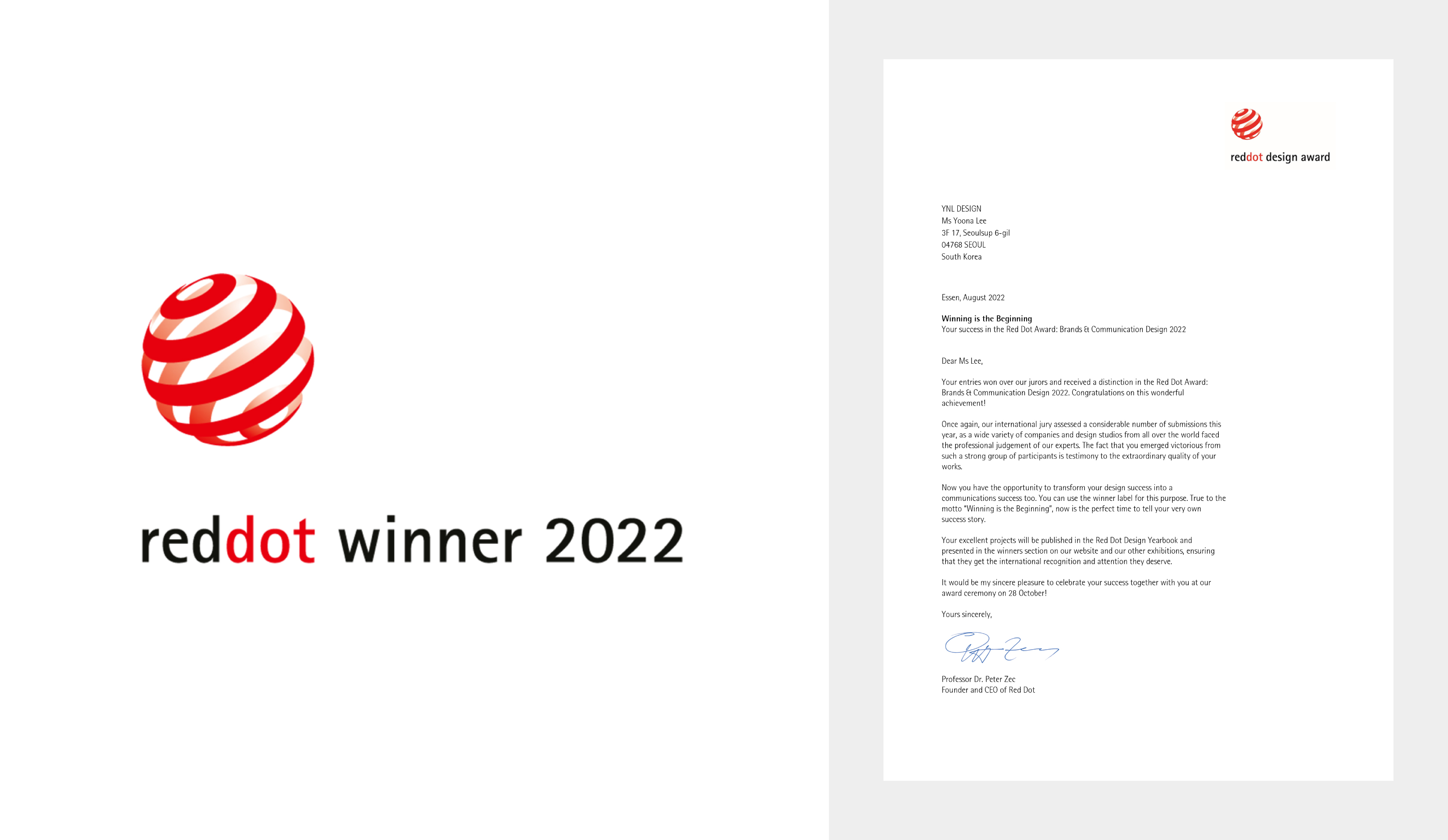 YNL Design의 ‘YNL Design CI Renewal (와이엔엘디자인)’ Corporate Identity와 ‘Kitsch Cow Butcher Shop (키치카우)' Brand Identity 프로젝트가 독일 ‘reddot design award 2022 (2022 레드닷 디자인 어워드)’ Brand & Communication 부문에서 본상 (WINNER, 위너)을 수상하였습니다.