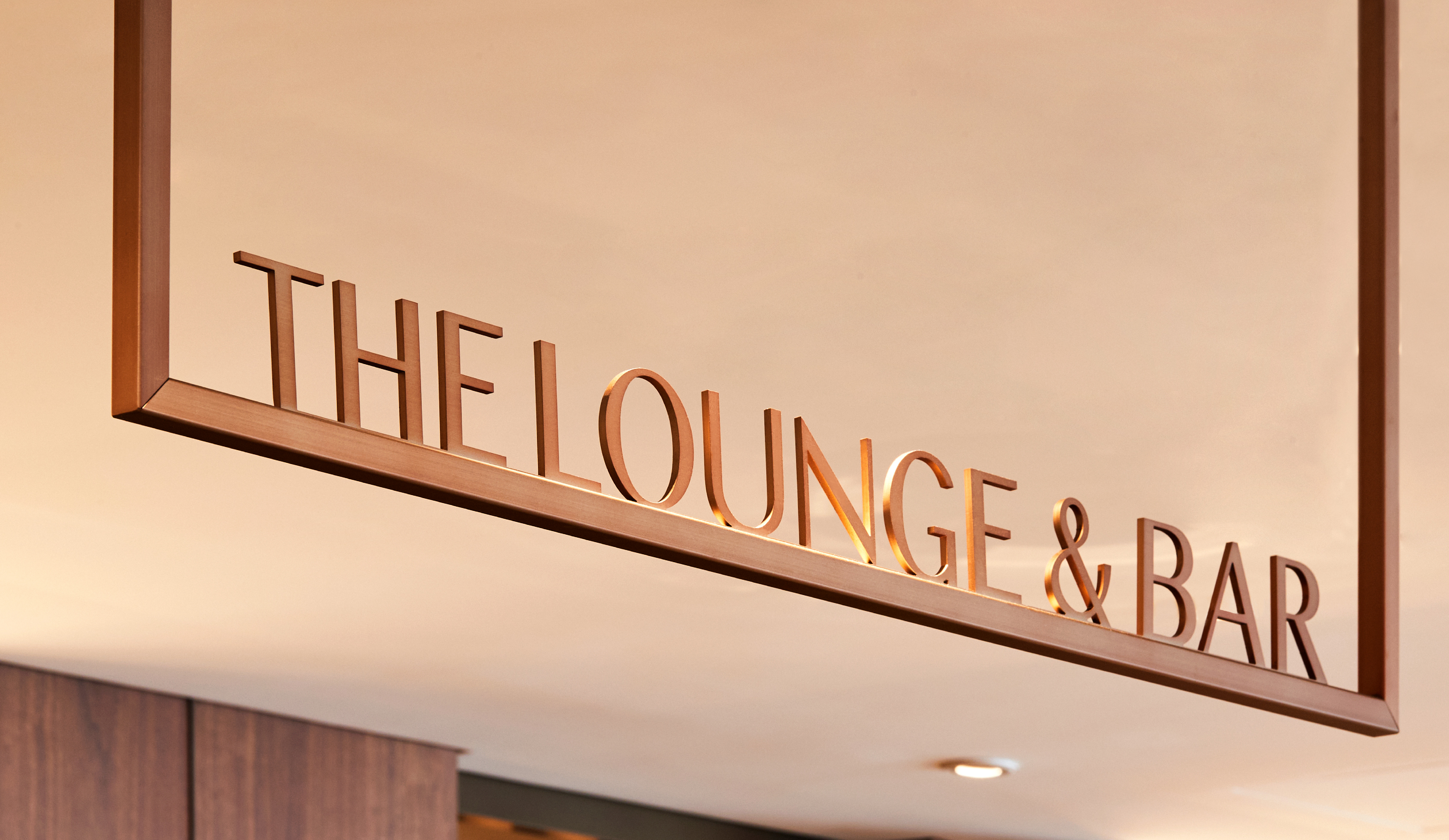 ‘THE LOUNGE & BAR’는 바의 특성을 살려 천장에 부착되는 브론즈 헤어라인 행잉 사이니지를 메인으로 지정하고 서브는 우측 벽면에 브론즈 헤어라인 재질의 스카시 사이니지로 디자인하여 호텔의 고급스러운 무드와 함께 고객들이 바로 인지할 수 있는 사양과 배치를 지정하였습니다. 럭셔리한 더 라운지 앤 바 무드와 어울리는 카멜 컬러를 지정하여 메뉴판에 적용함으로써 고급스러운 무드를 연출하였습니다. 전통과 감성이 공존하는 프리미엄 라이브 뷔페 ‘THE KINGS’의 사이니지는 헤어라인 브론즈 플레이트 위에 럭셔리한 골드 재질의 로고타입을 스카시로 디자인하여 한층 더 고급스러운 분위기를 더욱 강화하였습니다. ‘더 라운지 앤 바’ 공간과는 거리가 있는 곳에 ‘더 킹스’ 사이니지를 배치하여 2개의 브랜드를 고객들이 바로 구분할 수 있게 체계를 잡았습니다.